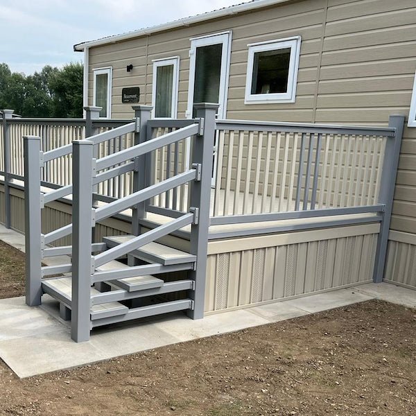 Transform your caravan’s exterior with this impressive 24’ x 8’ side patio with steps and a gate. This superior self-build decking kit from Deck Supermarket provides both a stylish and practical outdoor feature, adding a significant amount of space to your set-up.