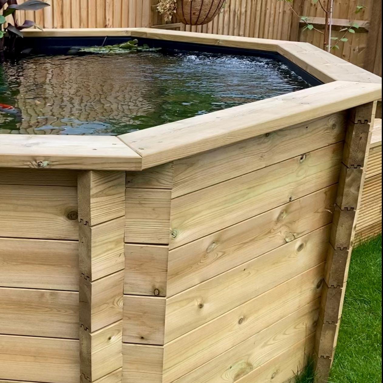 12ft, 1419 Gallon, Raised, Stand-alone Wooden Stretched Octagonal Koi Pond, 44mm thick, 1099mm high, 6452 litres. These beautifully crafted ponds