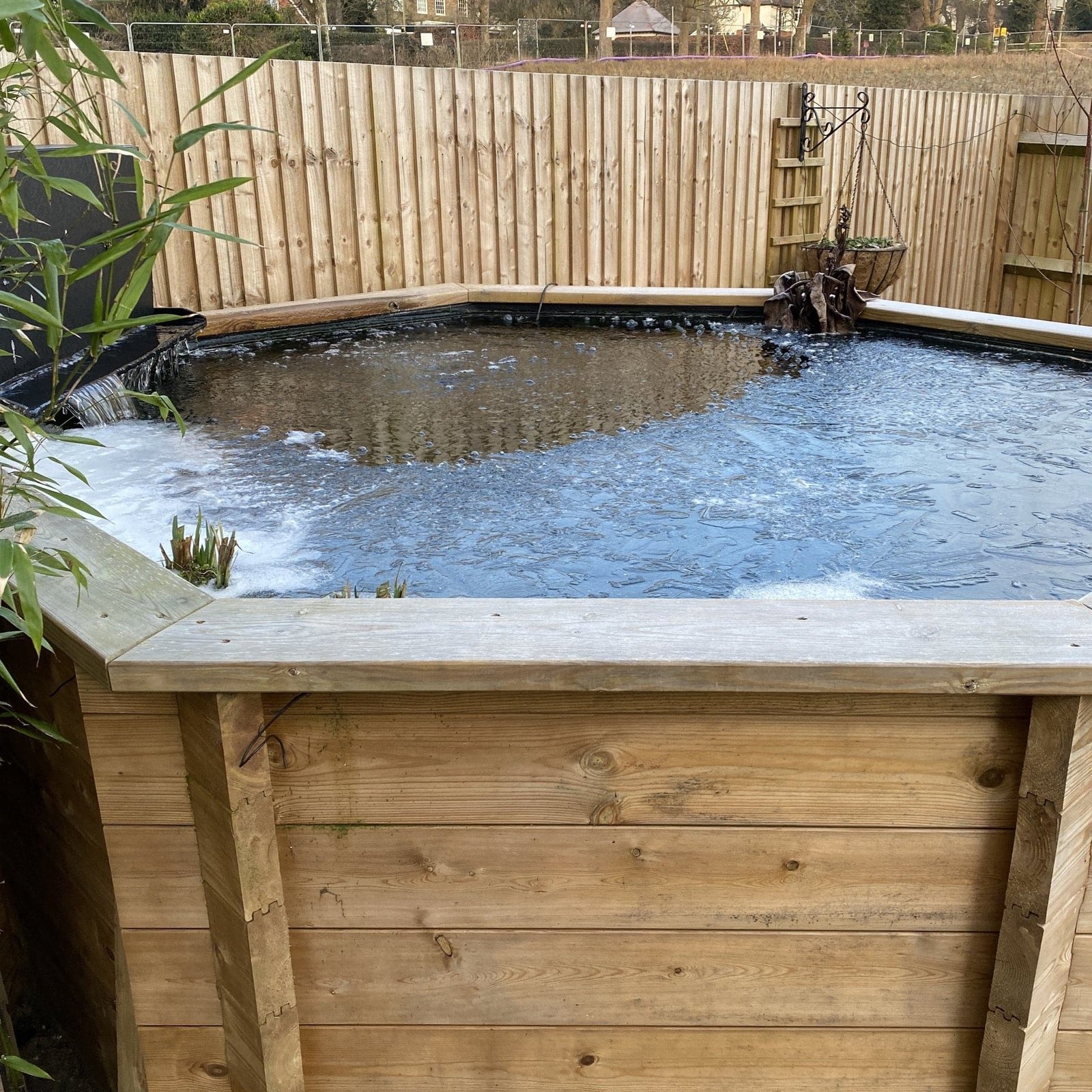 12ft, 2414 Gallon, Raised, Stand-alone Wooden Koi Pond, 44mm thick, 1099mm high, 10976 litres. These beautifully crafted ponds are an