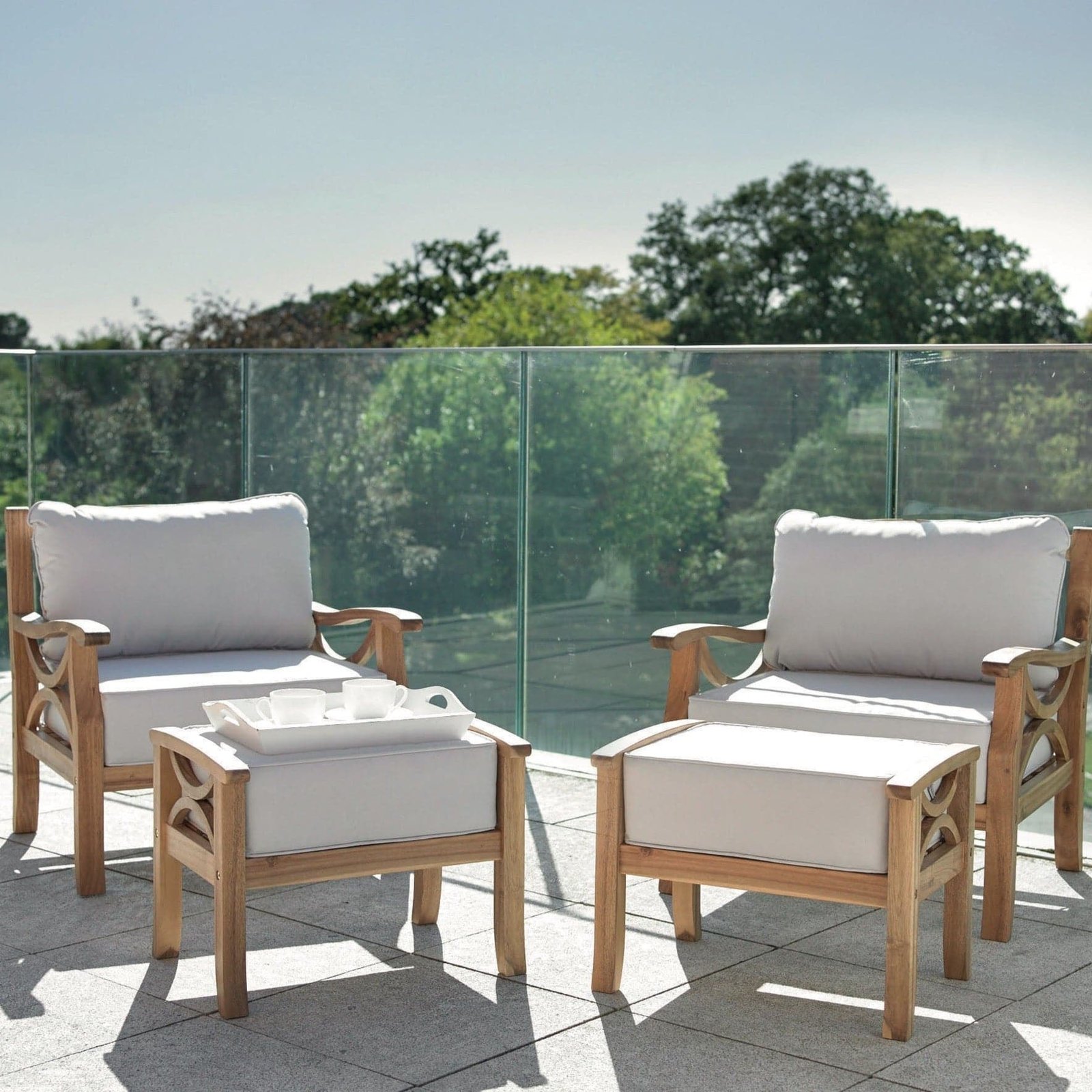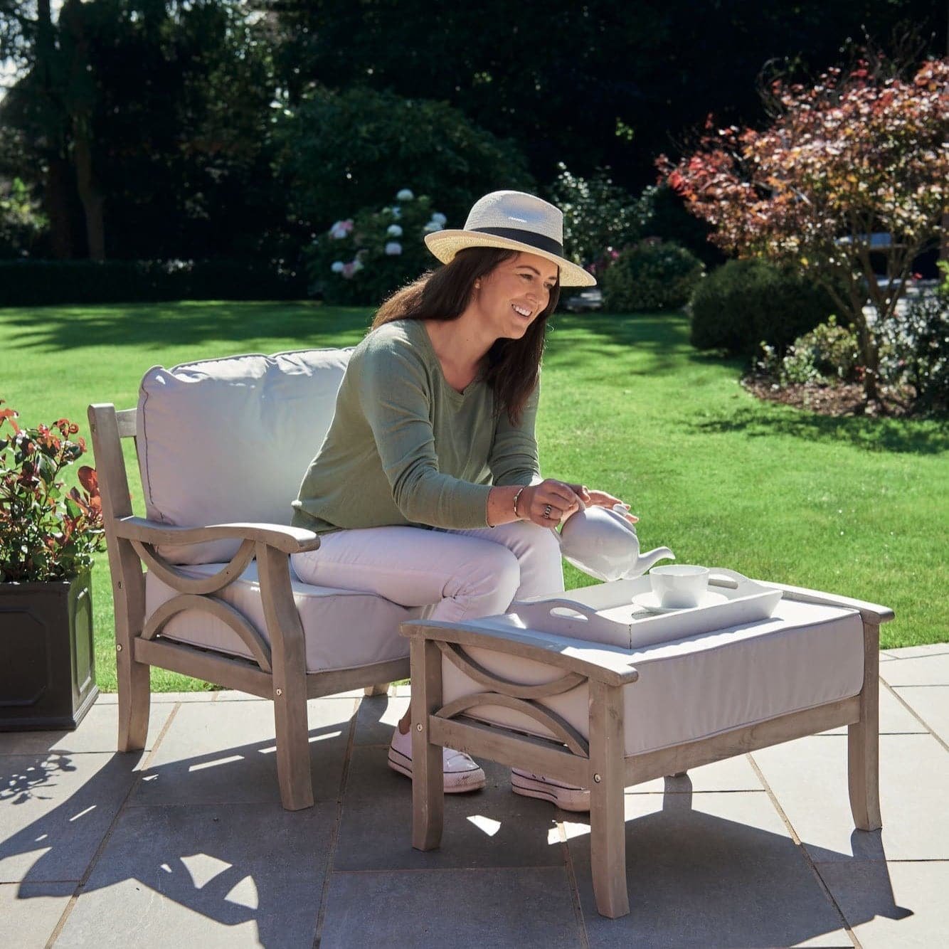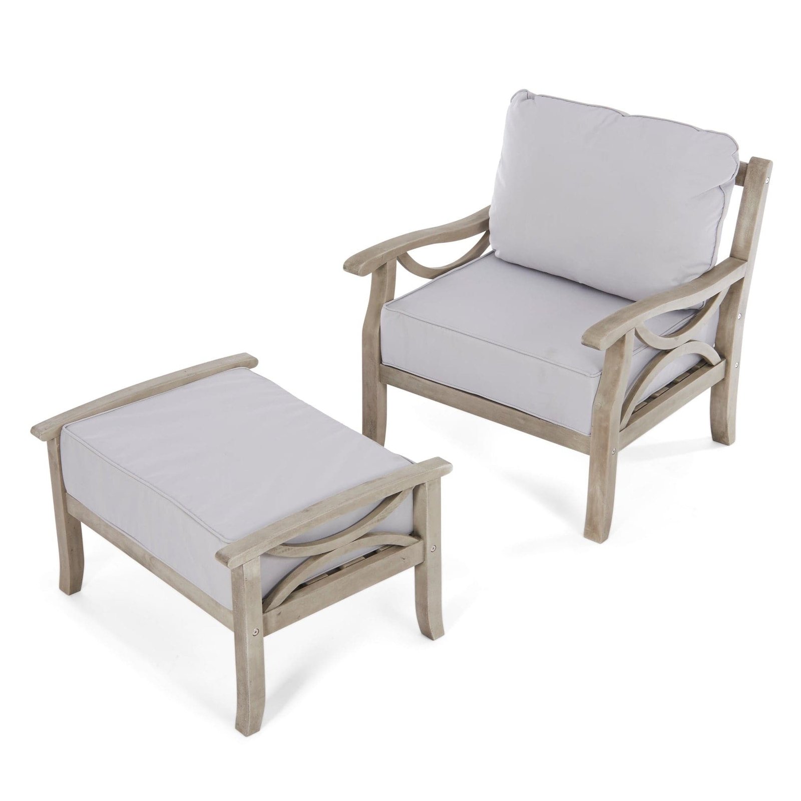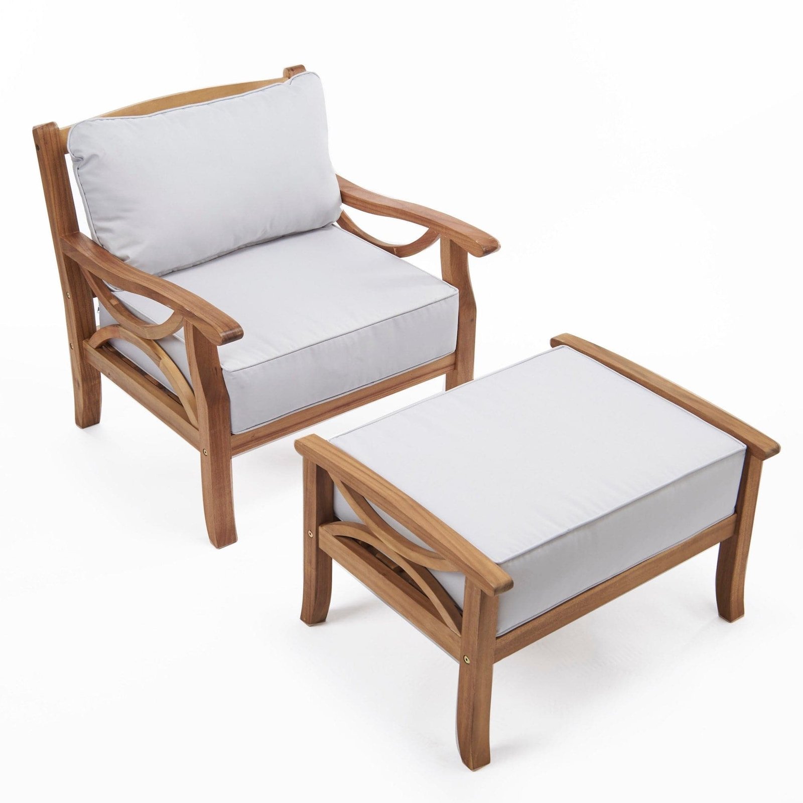 A beautiful outdoor armchair and footstool set, this is the ideal finishing touch for your outdoor space. Made from acacia hardwood timber which is naturally hard-wearing and weather-resistant, finished off in a choice of gorgeous natural oil or light grey finish, this is sure to last for many years to come and give your outdoor space a touch of class. Suitable for your garden or conservatory.