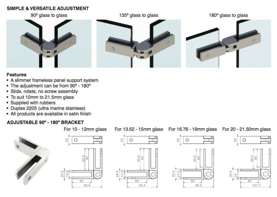The Adjustable Glass Stiffener can be used at a multitude of angles to help connect 2 panels of glass that join at a corner other than 90° ideal for use in conjunction with spigots or frameless applications and suitable for 10-21.5mm glass.