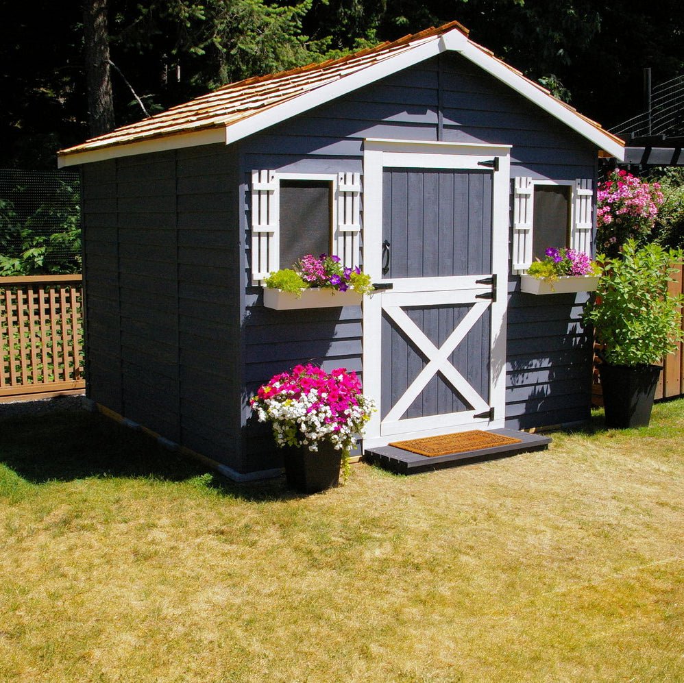 The Cedar House is a wonderful addition to your backyard! This heavy duty wooden shed includes a handy dutch door, floor and comes with 2 fixed windows with shutters and planter boxes. The exterior finishing is 100% Western Red Cedar… environmentally-friendly, durable and aromatic. This modern and functional garden shed makes a great outdoor recording studio. Free Shipping, Always! Metal Roof Option: Comes with 26 gauge corrugated metal roof system. Pre cut panels – stylish charcoal grey color, 40-70 year lifespan. OSB Roof Option: The Cedar House comes with pre-framed roof panels with OSB sheathing on top. Install your choice of shingles or metal roofing. Storage Shed Kit Features: Customize Your Wooden Studio Shed Kit! Manuals: Essential Information: |