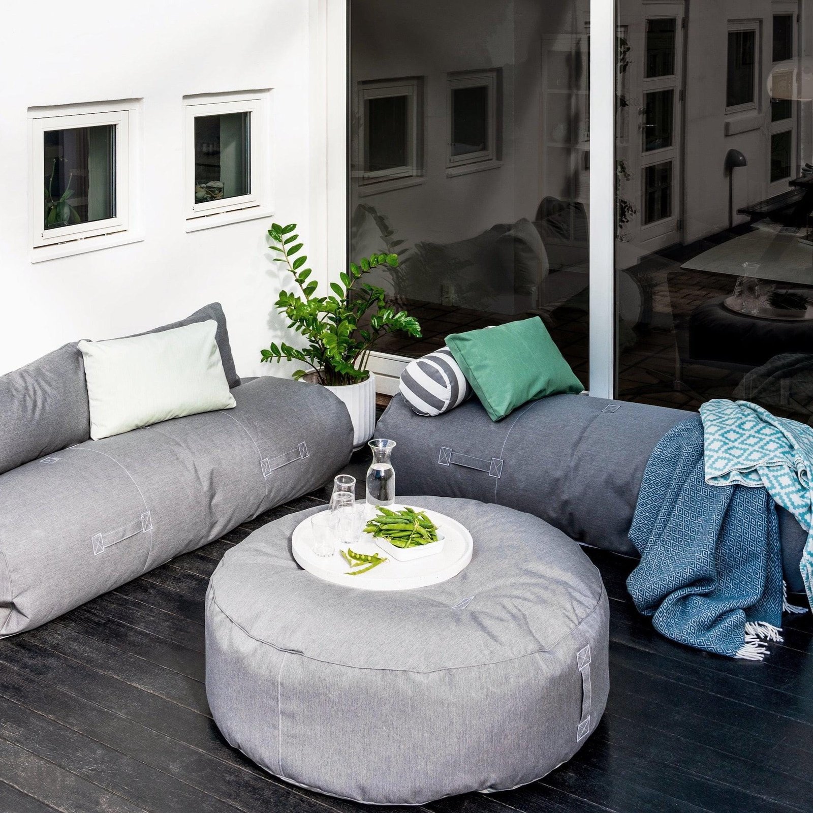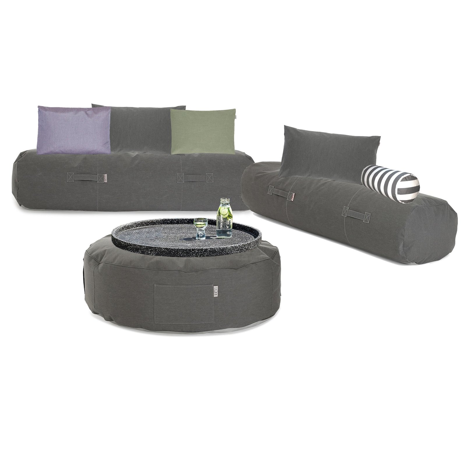 Create a cozy sofa corner with the two Rocket Daybeds and cushions. Use the big pouf Full Moon as a table, with the Terrazzo Tray on top. Or put them all on the grass and use them as sun beds on the hot days, this set has so many possibilities for the larger family.