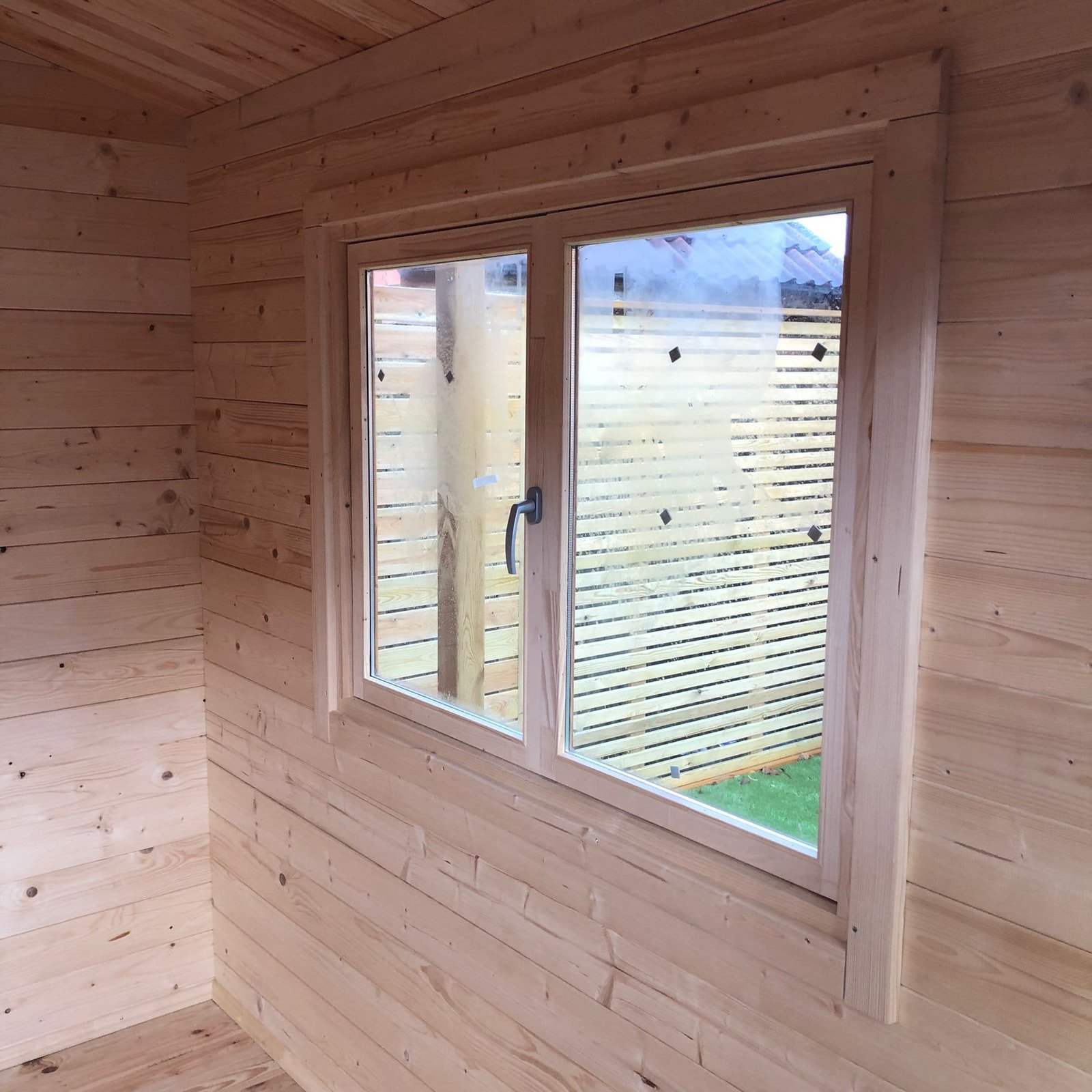 Beautiful Log Cabin type garden office pod, interlocking 44mm slow-grown spruce timber logs make for a lovely feel and smell and a perfect environment for working, working out, a kids play room, indeed anything you want, with double glazed windows and heavy duty mineral felt roof covering, this is a truly luxurious cabin but very cost-effective.