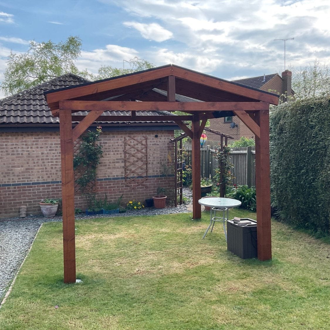 This kit option is the timber frame kit only, no roof ply, fascia’s or shingles included, view our Complete Gazebo Kit with Featheredge Roof. This kit has been left without a covering so you can add your weatherproof covering of choice, the gable ends are already assembled for you.