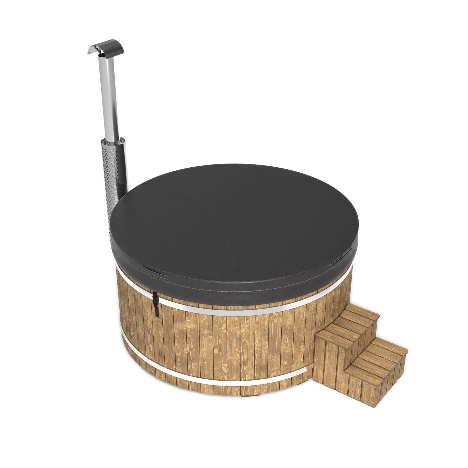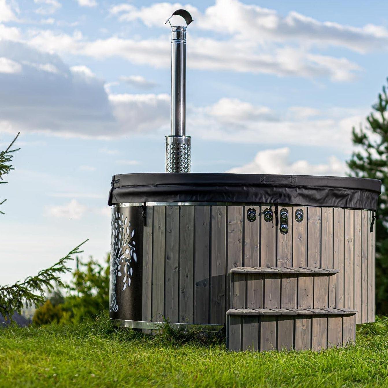 The “Henri” XL 225cm 4-10 person Scandinavian Spruce, thermowood or WPC Composite clad, wood fired hot tub with integrated heater, optional spa systems and other luxurious extras.