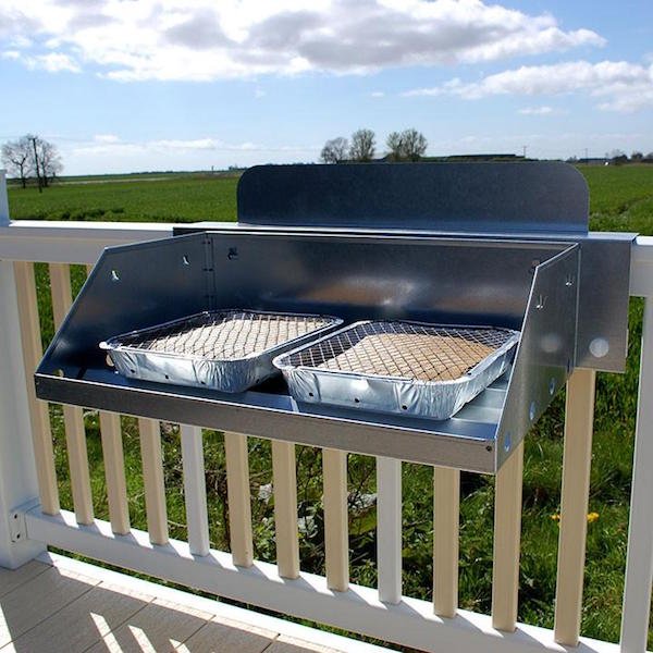 It is designed to be compatible for usage with or on PVC / metal / Wood or glass balcony rails. It just slips over the rail and once secured into place using the two adjusters you SIMPLY place your chosen disposable BBQ on the raided stand and away you go. The base is lifted enabling air to circulate to help the disposable BBQ burn more efficiently.