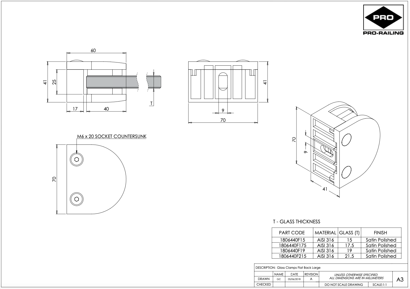 - Glass Clamps supplied with rubbers.