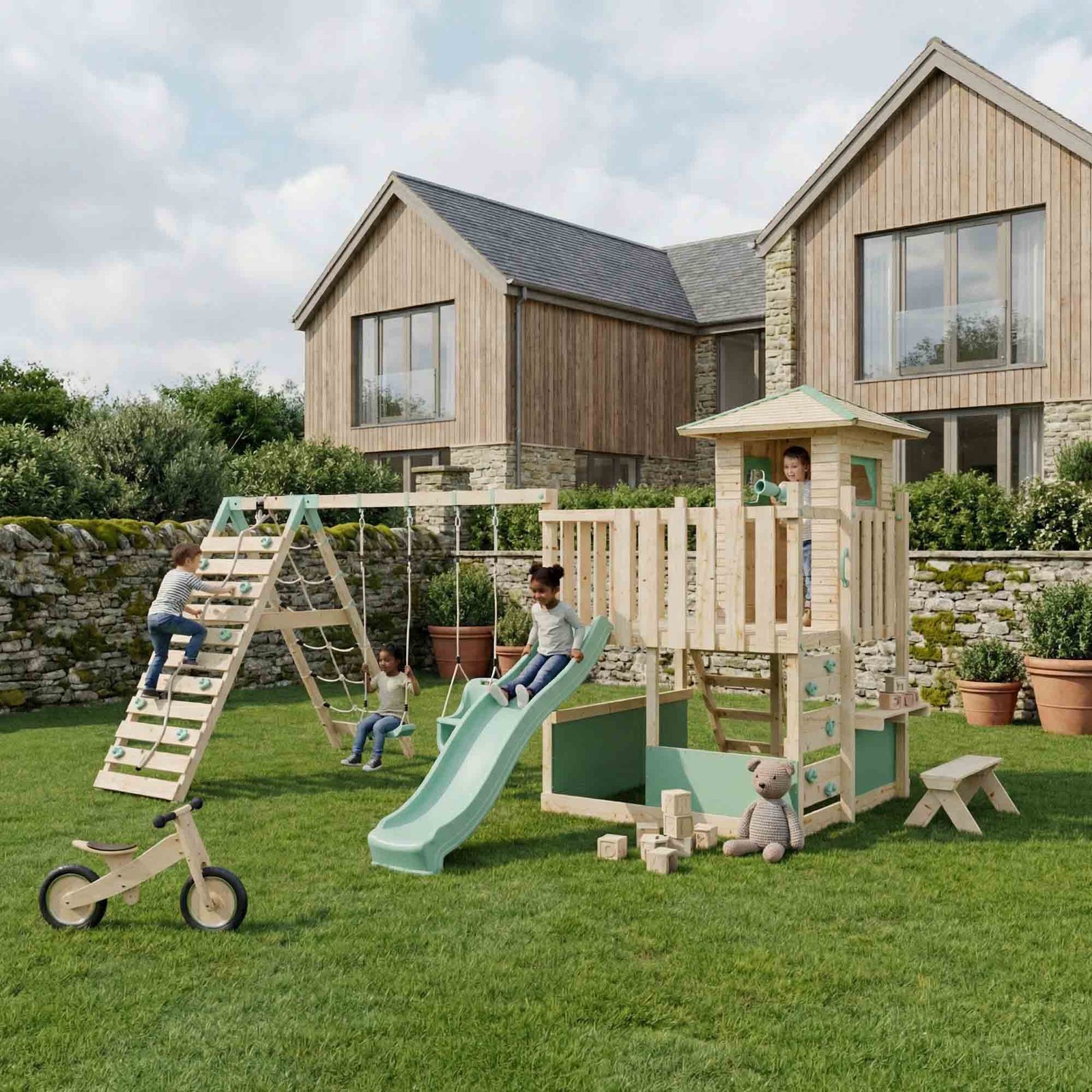 The untreated natural wood finish is chemical-free and eco-friendly, blending seamlessly into outdoor spaces while giving you the freedom to choose your own protective treatment; clear, coloured, or left natural, for both durability and style. With our extensive range of climbing frame components, you can decide what’s included. From double swings to baby swings to monkey bars, you can design the perfect climbing frame for your space.