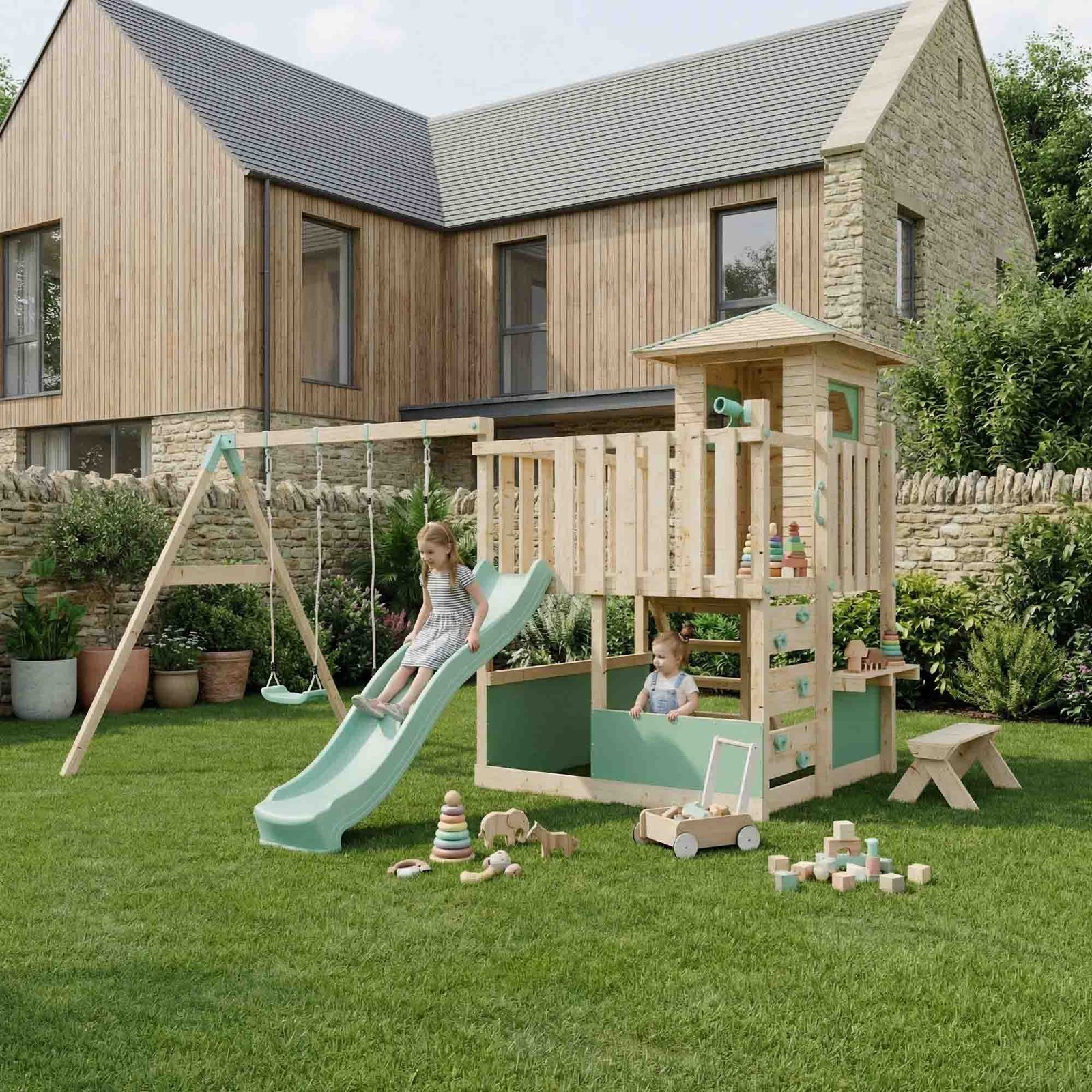 The untreated natural wood finish is chemical-free and eco-friendly, blending seamlessly into outdoor spaces while giving you the freedom to choose your own protective treatment; clear, coloured, or left natural, for both durability and style. With our extensive range of climbing frame components, you can decide what’s included. From double swings to baby swings to monkey bars, you can design the perfect climbing frame for your space.