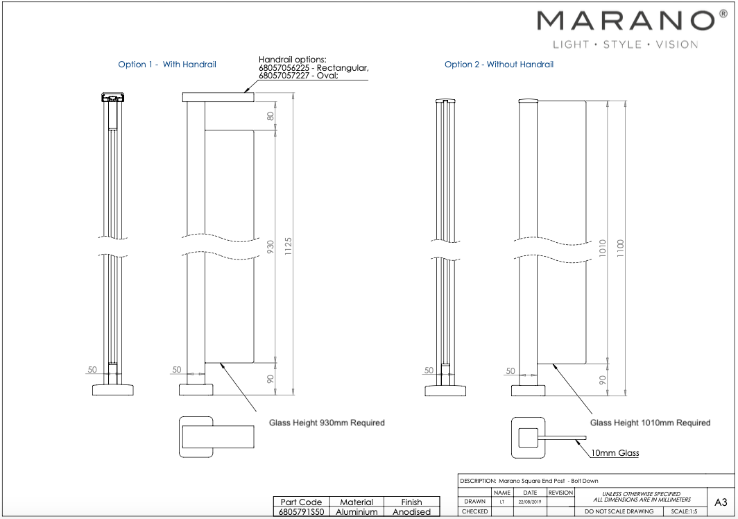 Marano base fix 1100mm high, 50 x 50mm square bolt-down end post in aluminium satin Silver Anodised or Black Powder coat finish.