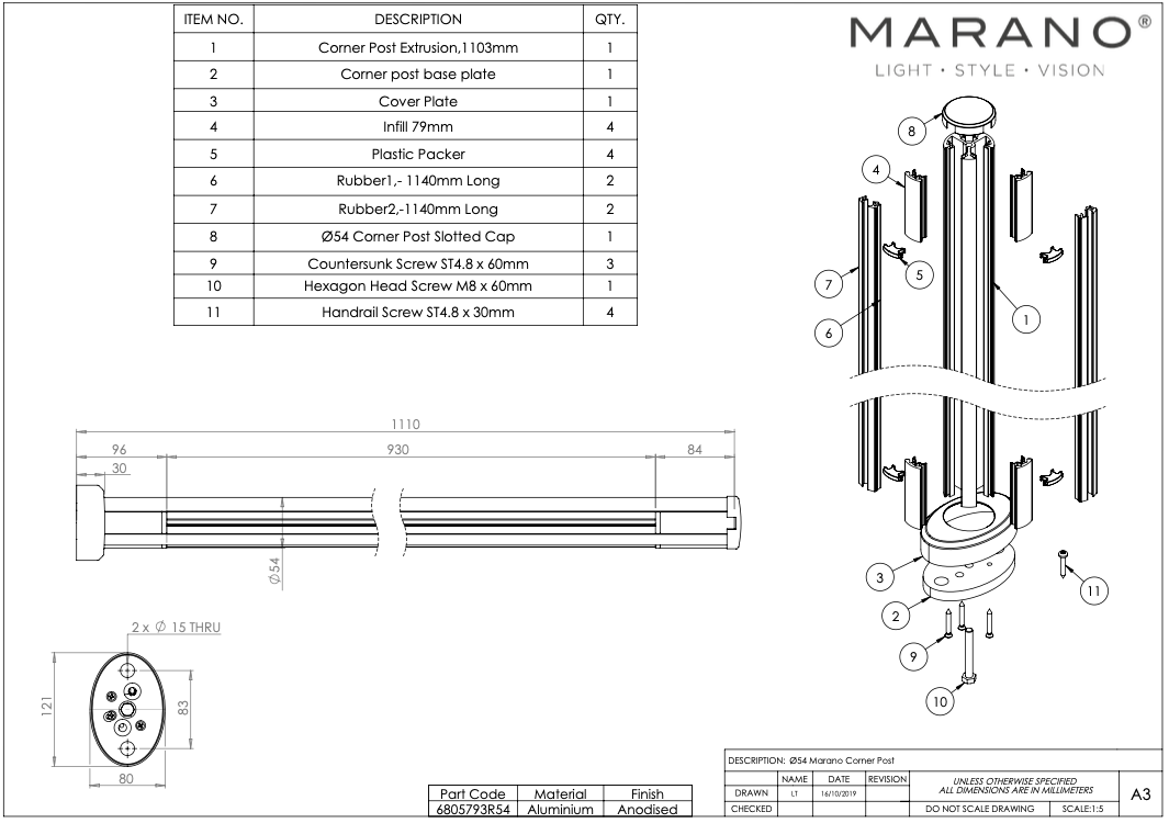 This Marano Round Base Fix Corner Post 1100mm Aluminium Satin Anodised Finish is designed for Marano Round railing applications. The post boasts a 54mm diameter and durable aluminium satin anodised finish, making it a reliable and stylish choice for your build.