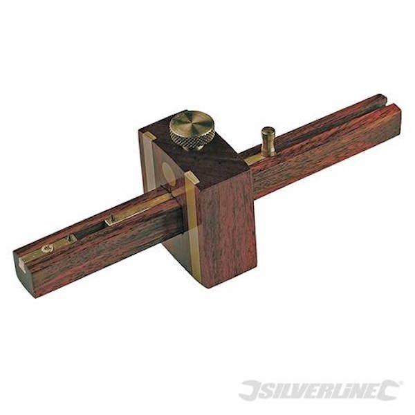 Hardwood body with knurled brass adjusting screw. Inlaid brassware faces and brass slide. 2 hardened marking spurs.