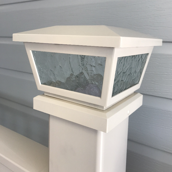 The  Premium Solar Post Cap is post mounted. The side panels are real pebbled glass and will fit over a 4″x 4″ (102mm x 102mm) post. These solar post caps will highlight any deck or fence post. They are built using a solid PVC construction with tempered glass panels.