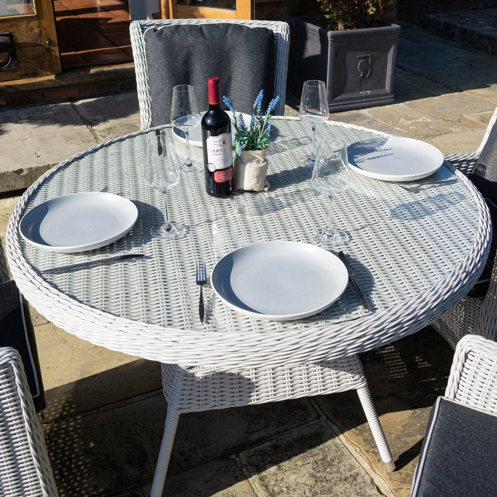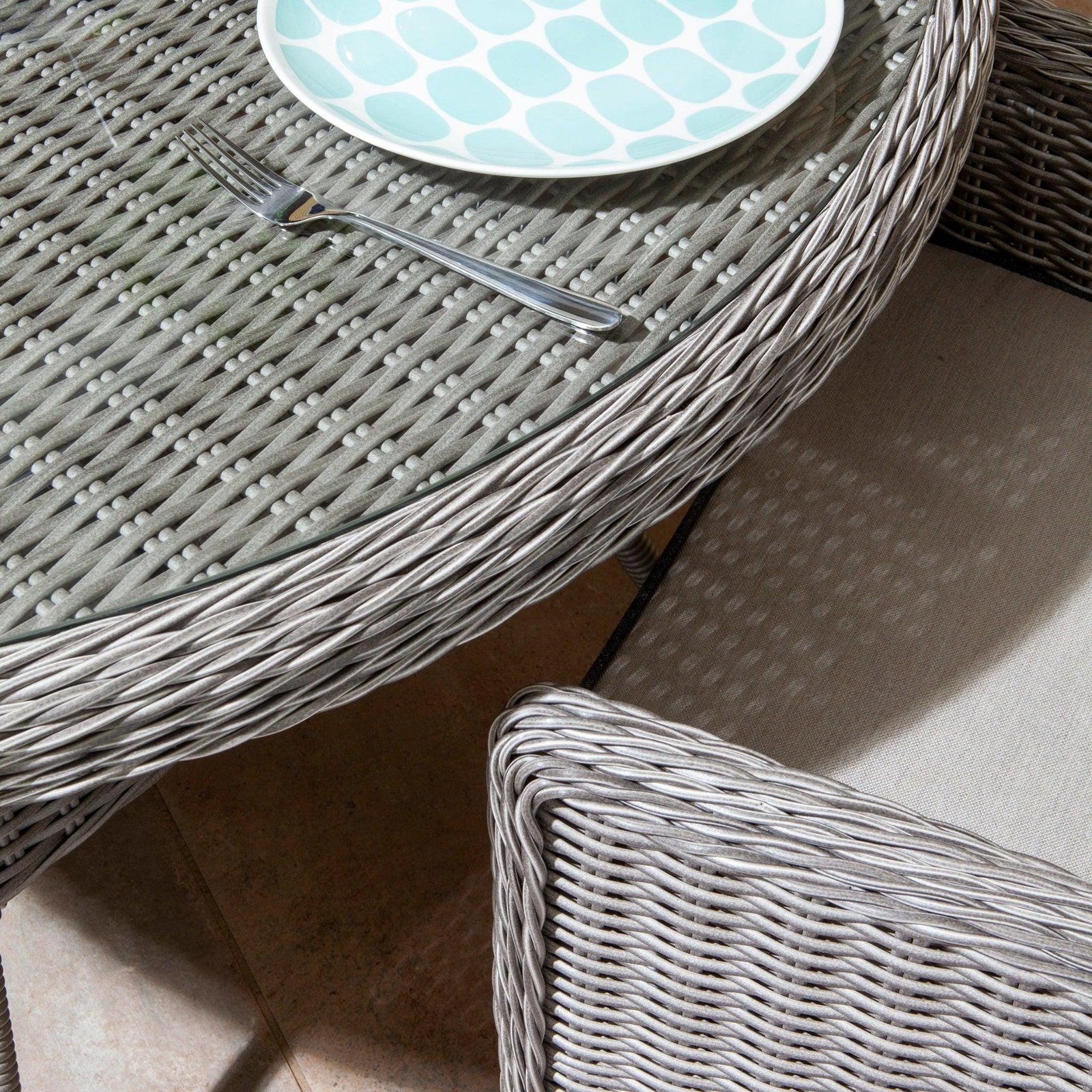 Rattan effect, Putty Grey or Natural Stone Colour, four person dining set with glass top table with parasol hole. The Lazy Susan in the middle of the table makes for perfect AlFresco meal times.