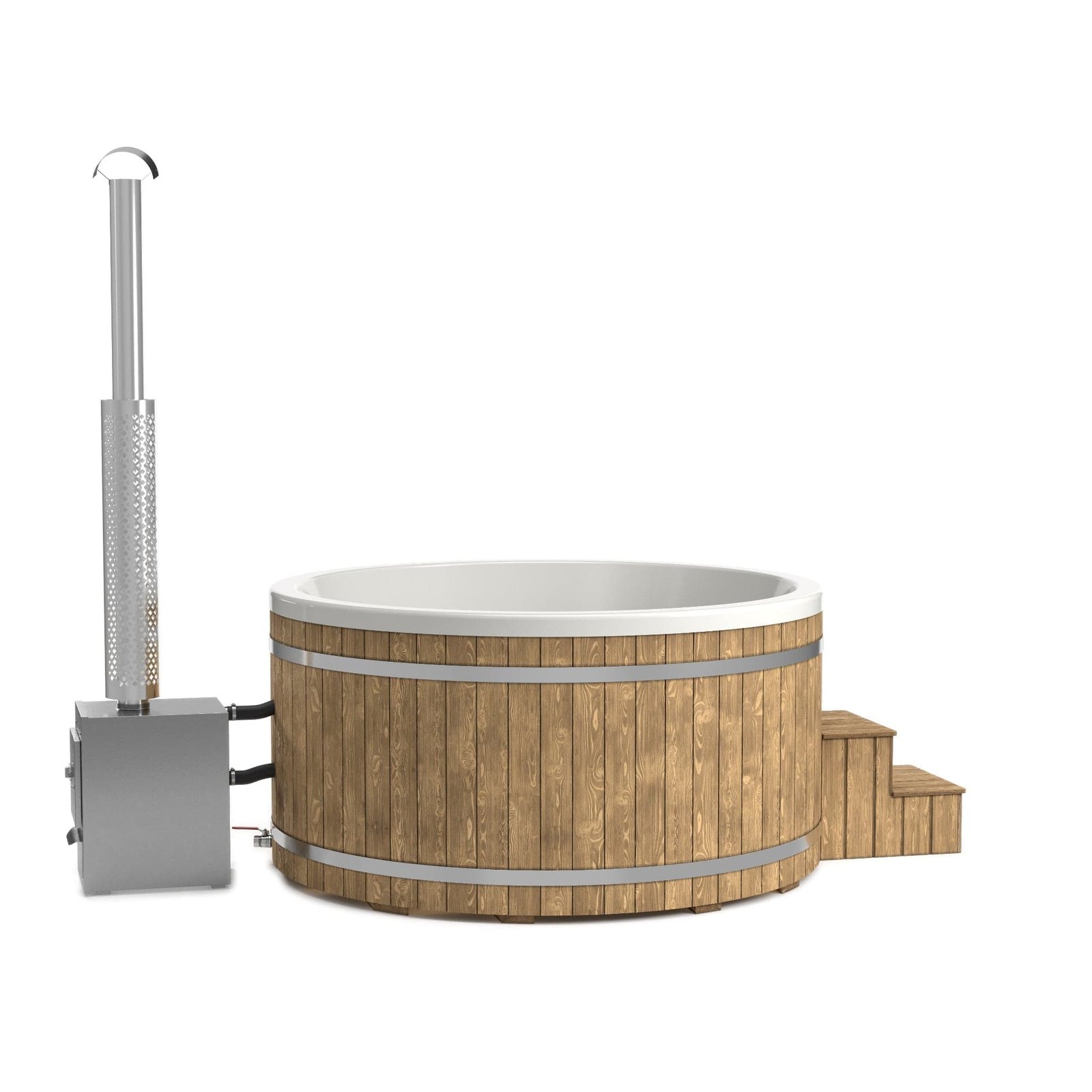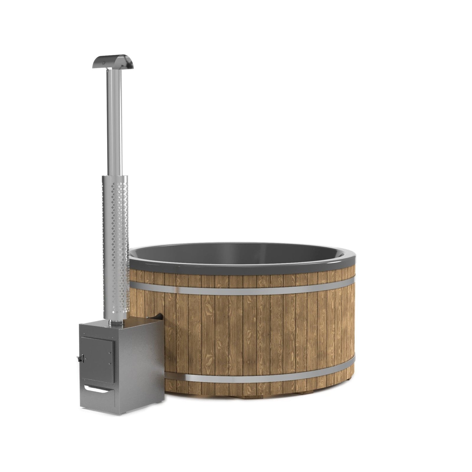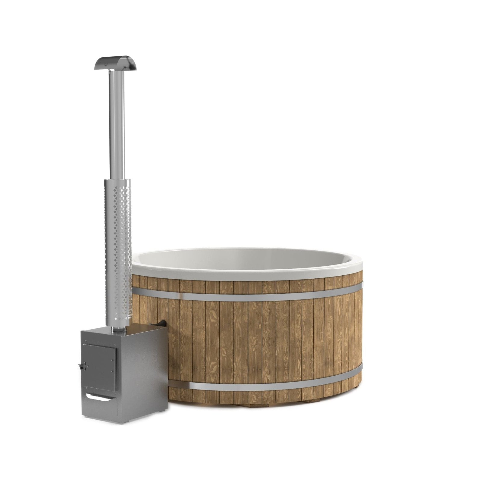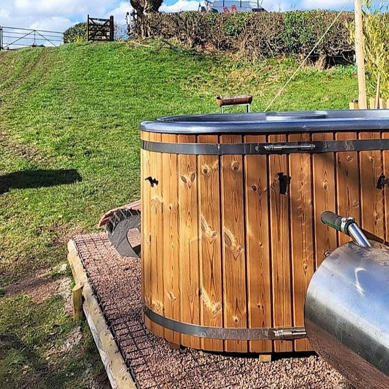 The “RenĂ©” 200cm 4-8 person Scandinavian Spruce, thermowood or Composite clad, wood fired hot tub with external heater, optional spa systems and other luxurious extras.