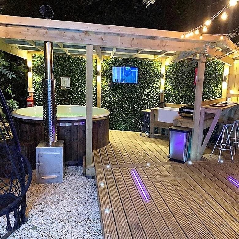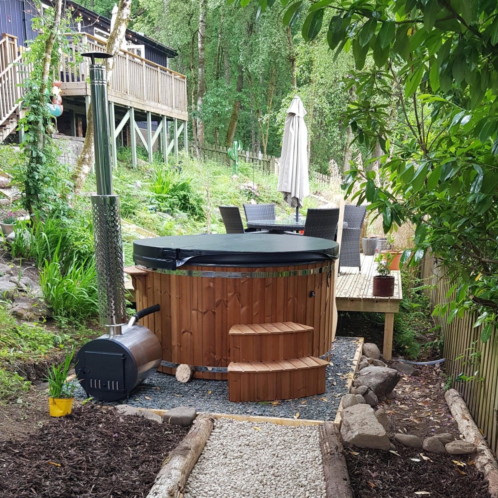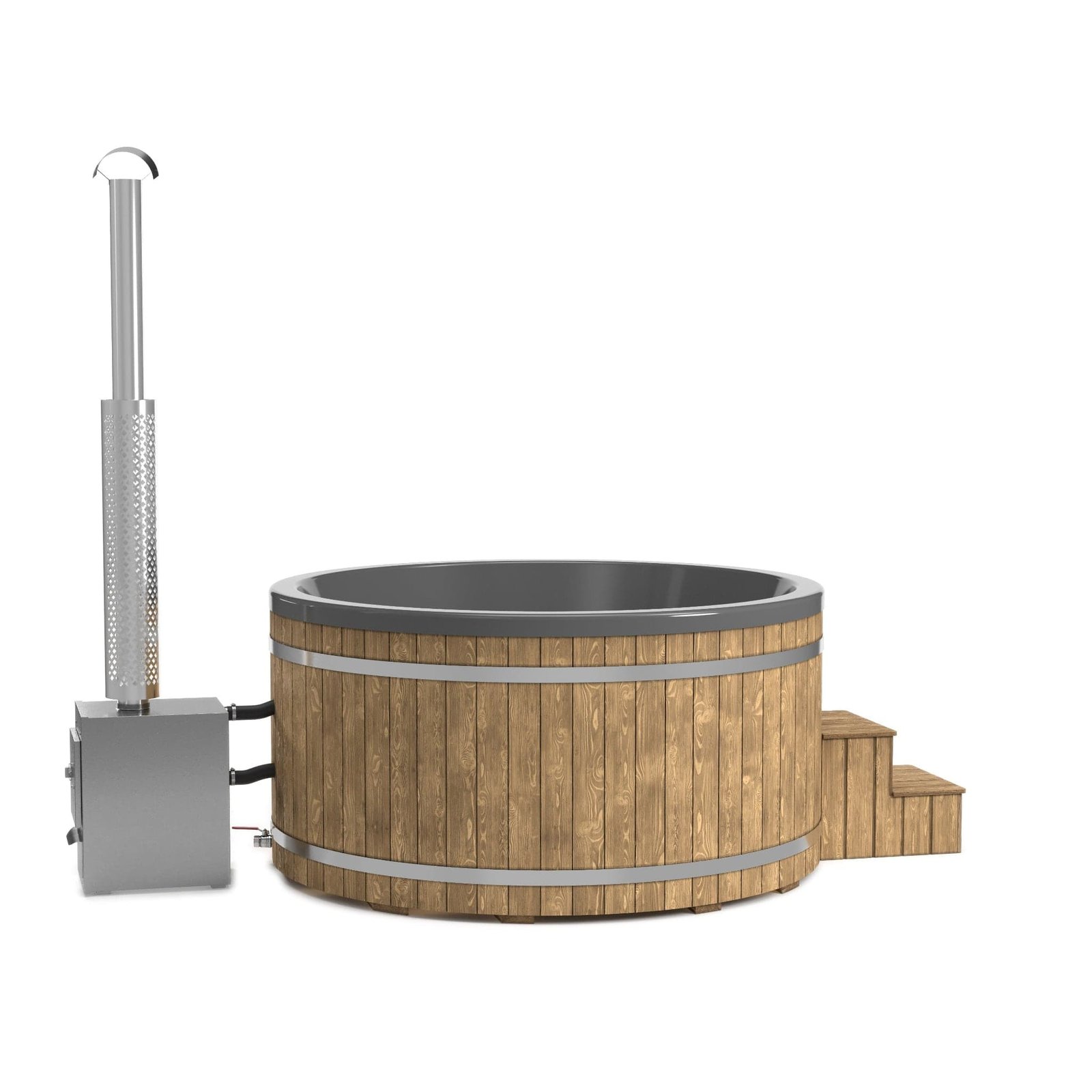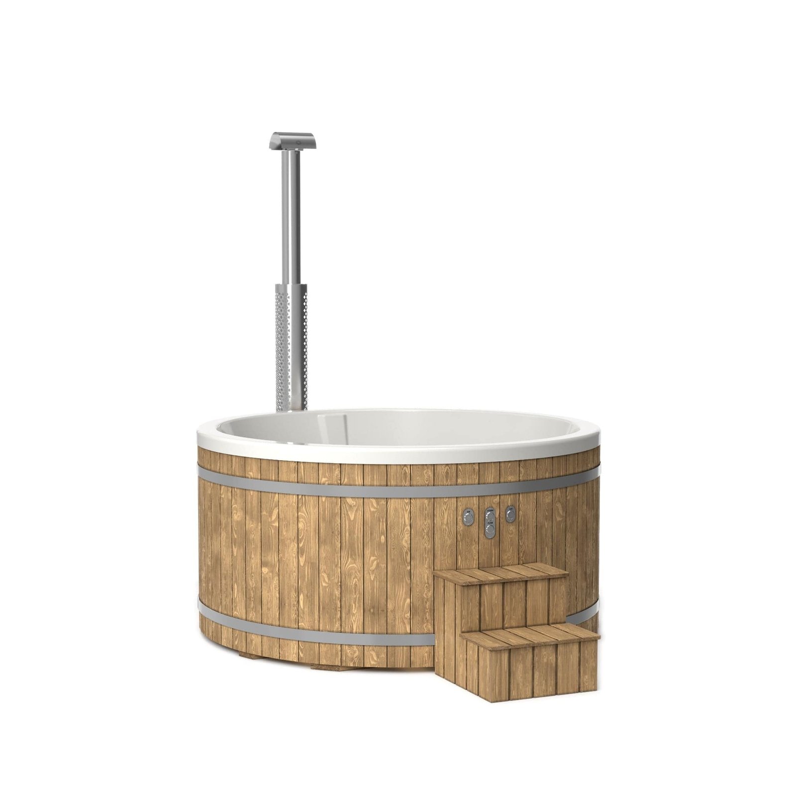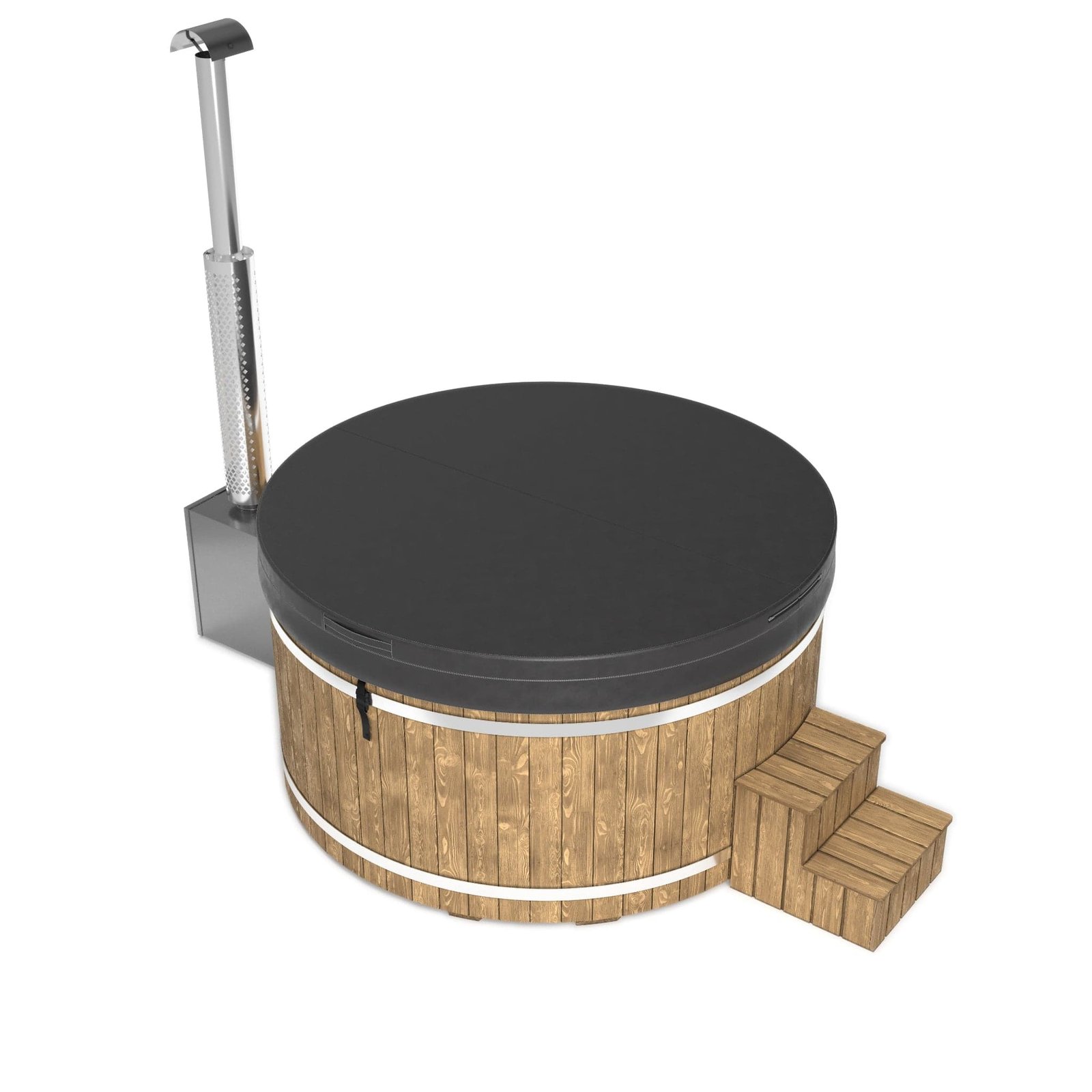 The “RenĂ©” 200cm 4-8 person Scandinavian Spruce, thermowood or Composite clad, wood fired hot tub with external heater, optional spa systems and other luxurious extras.