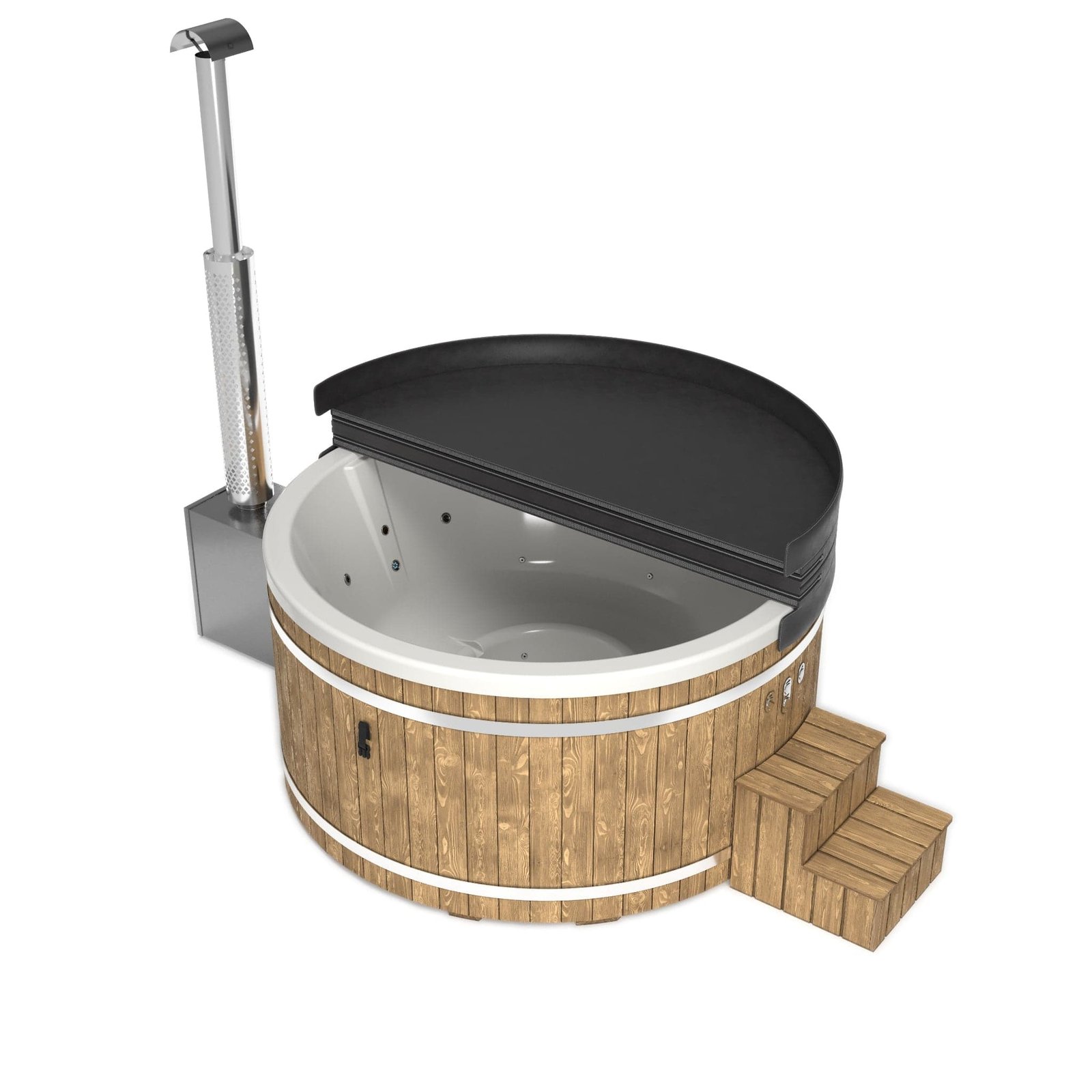 These tubs are clad in Scandinavian spruce, thermowood or composite and are available with an array of extras, an ergonomic liner moulds to your body and the heater is external to the unit on this model providing more space inside for guests, this tub is designed for 4-8 people.