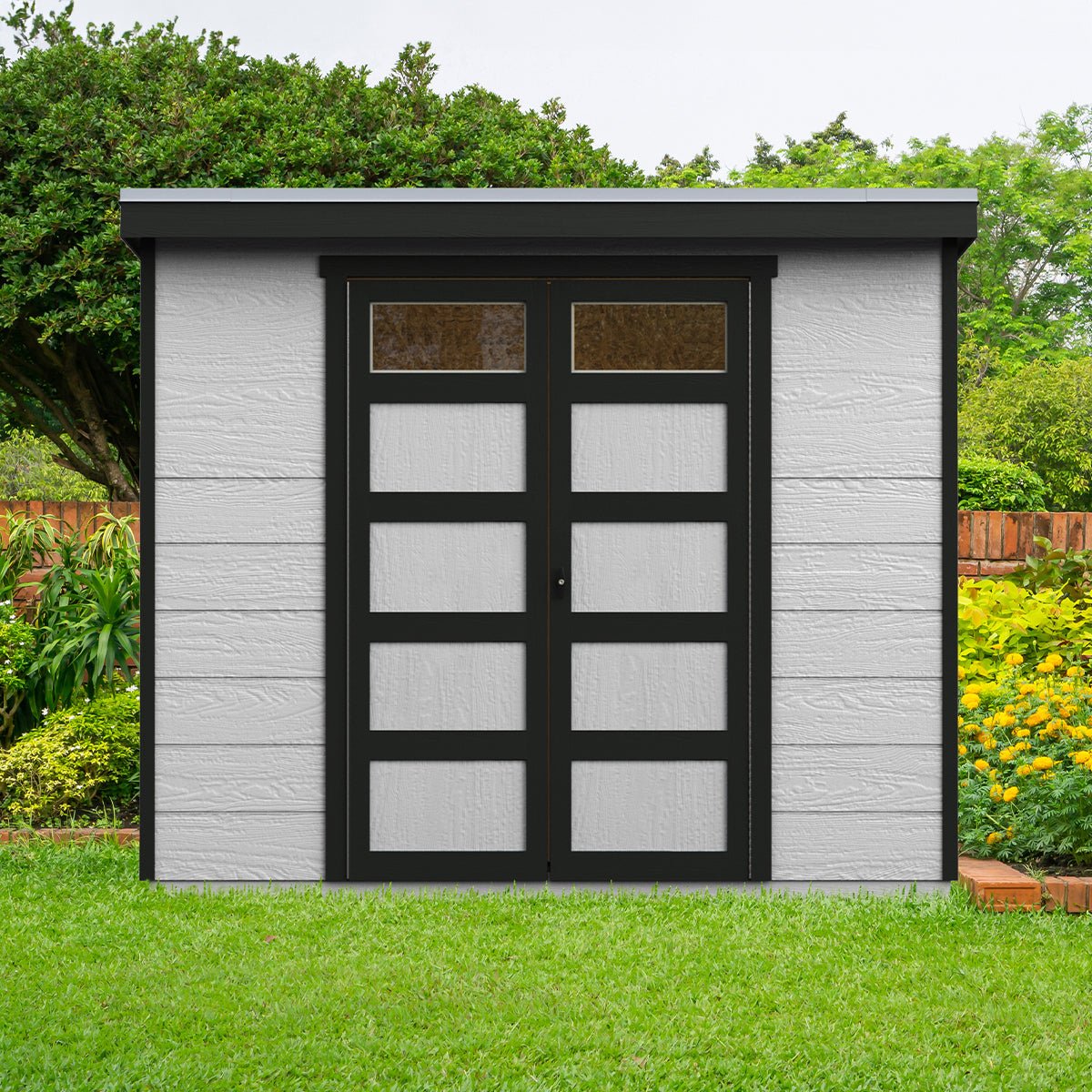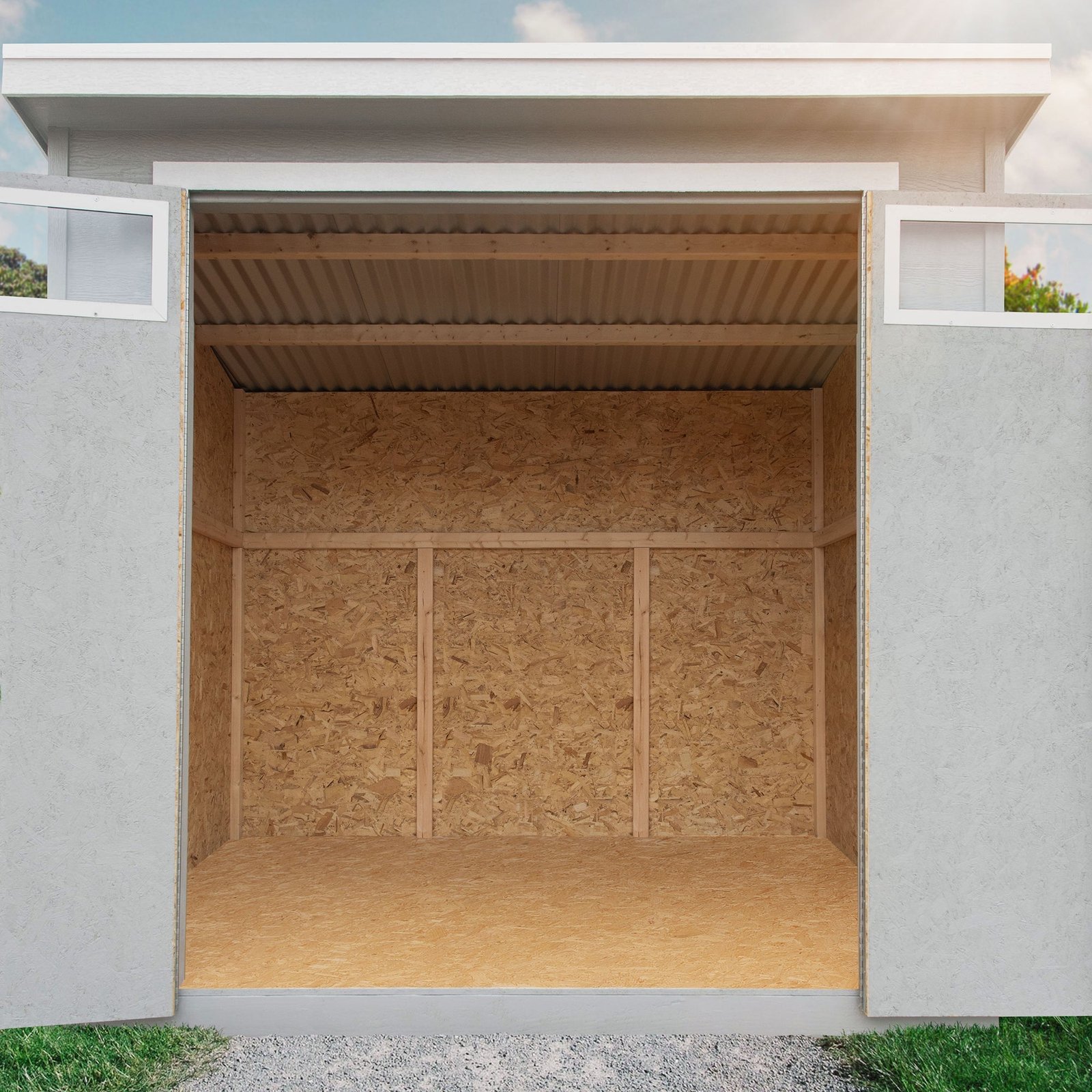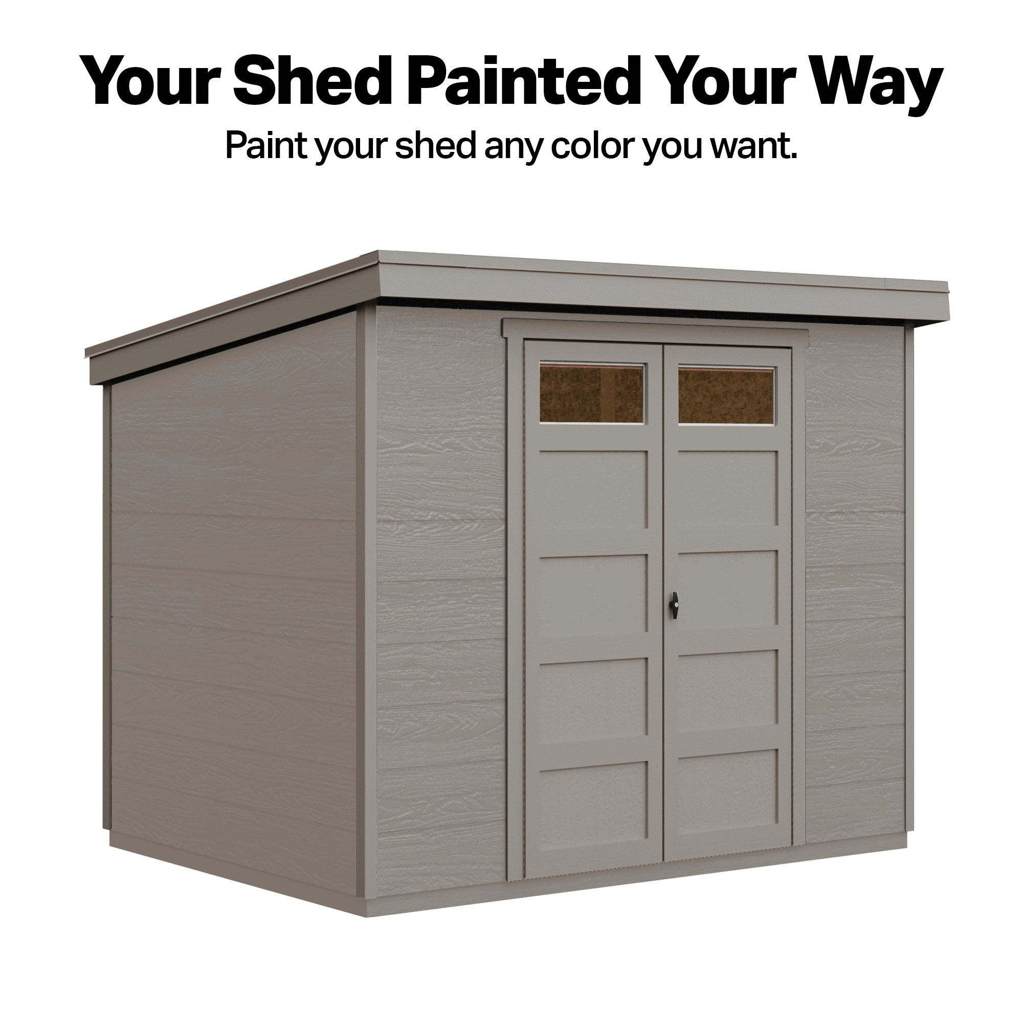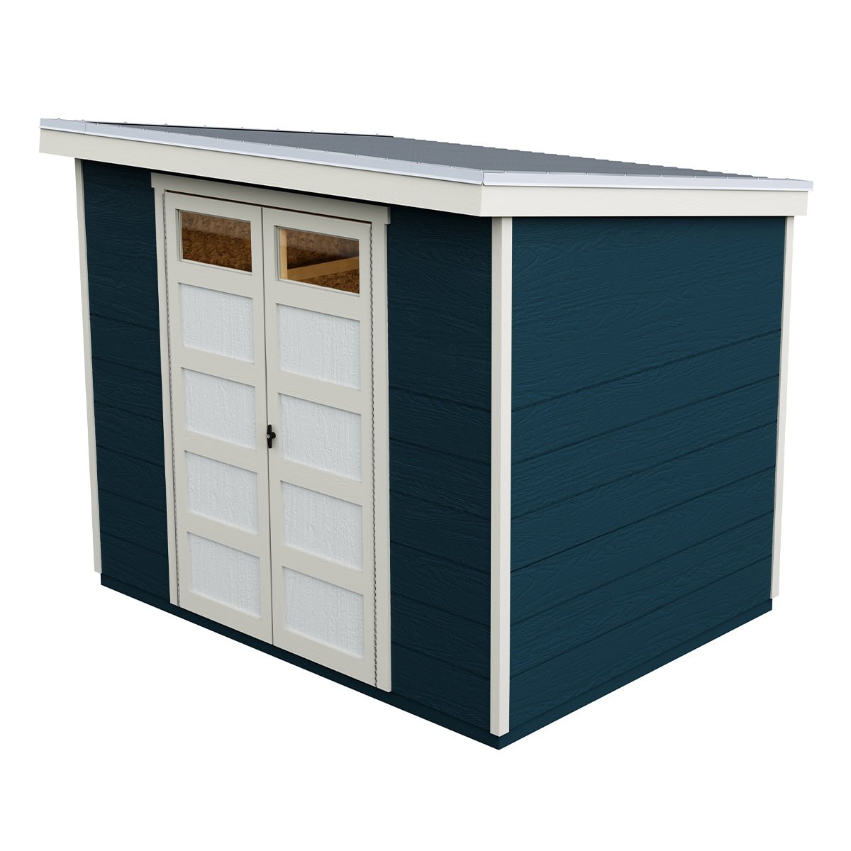 The Sherbrooke Shed offers modern design with durable, weather-ready features. Measuring 8′ x 6′ (48 sq. ft.), it includes a Palram® Suntop® polycarbonate roof for superior weather protection. The 7-foot tall front wall and 6-foot tall back wall easily accommodate long-handled tools, while 48-inch wide double doors provide easy access to equipment. Two transom door windows allow natural light inside, and a locking T-handle with two keys keeps your belongings secure. Build it yourself to save or choose professional installation for a hassle-free setup.