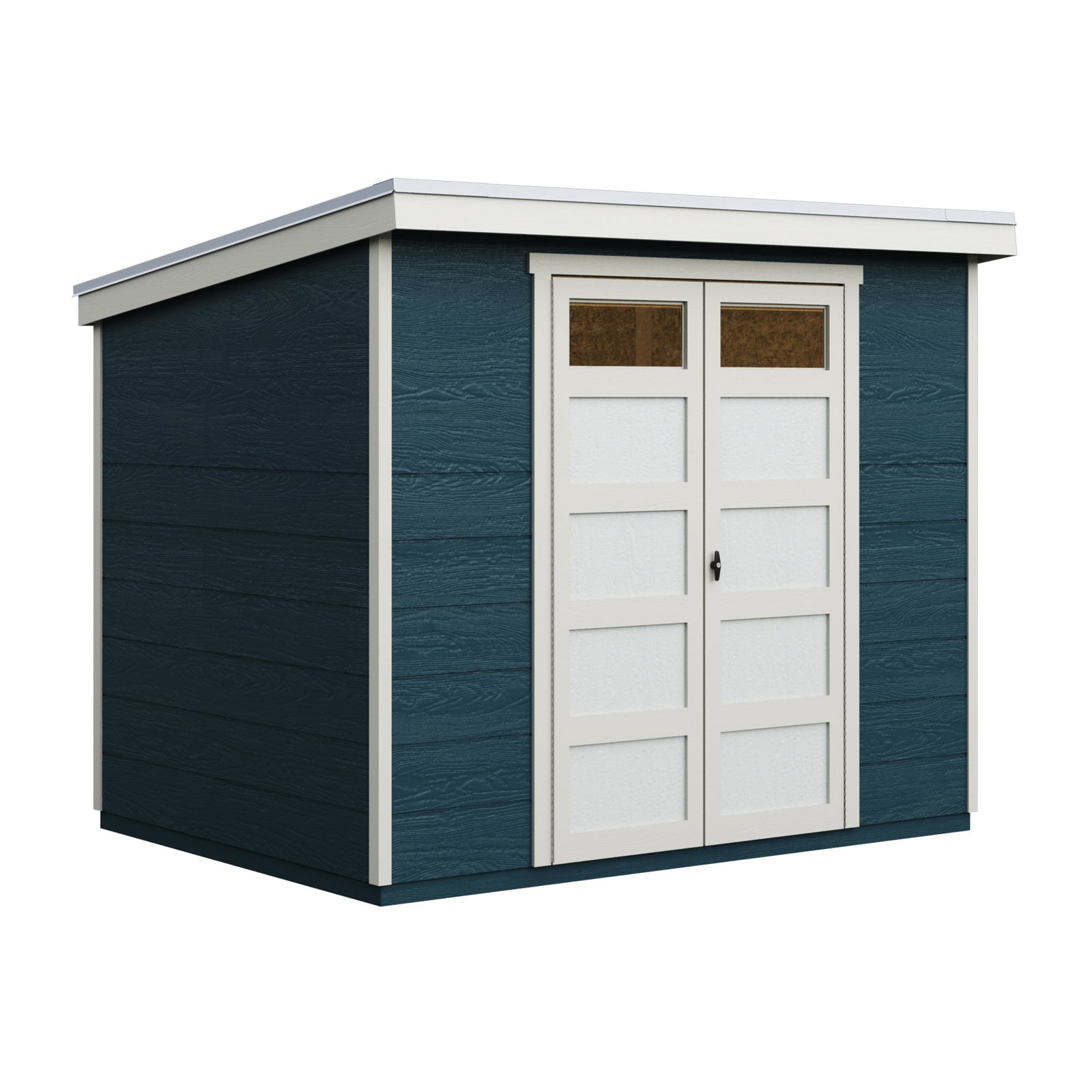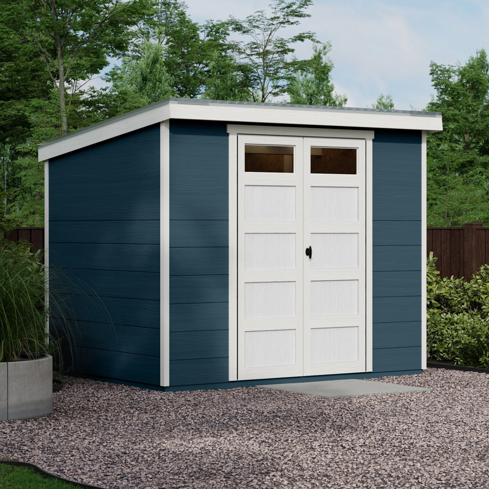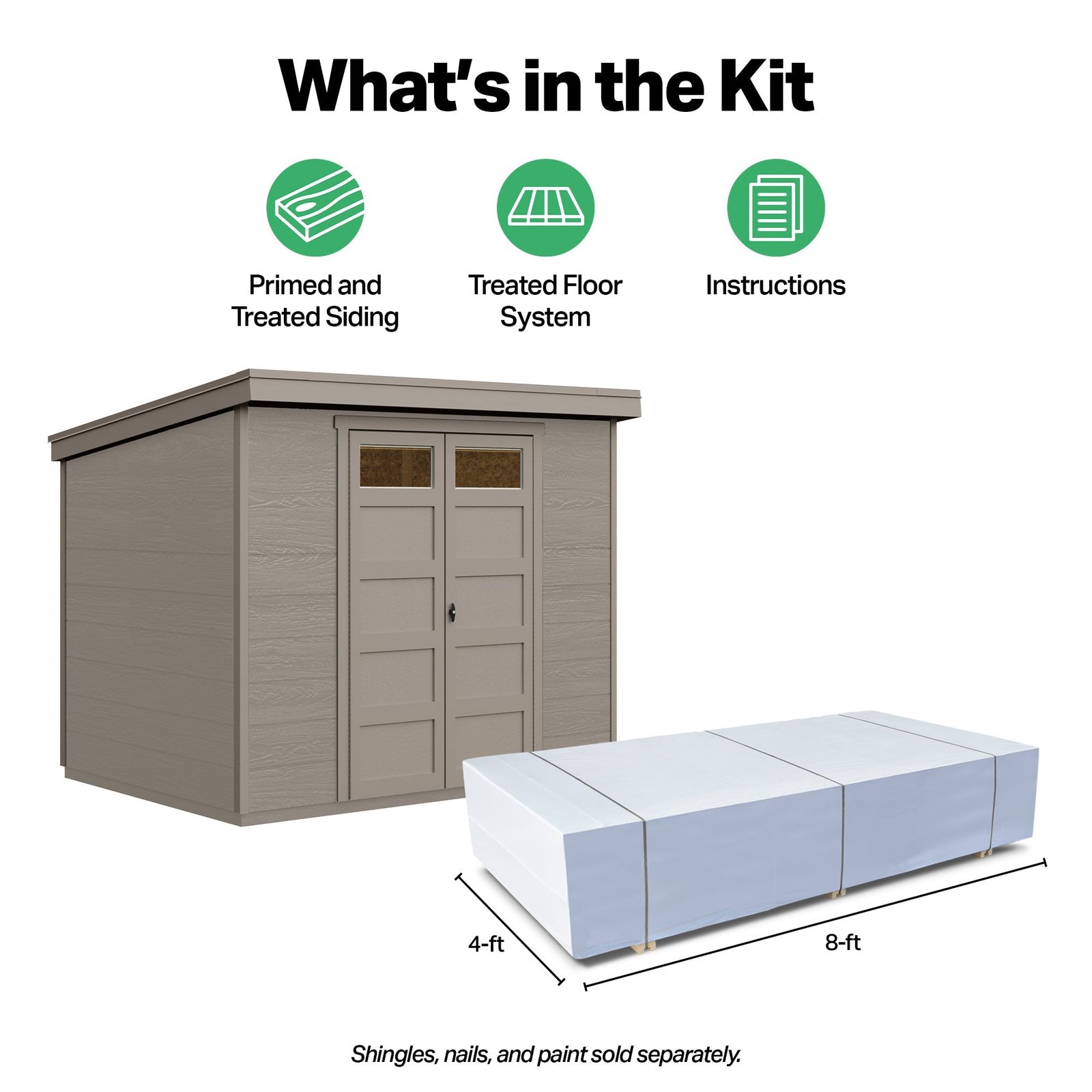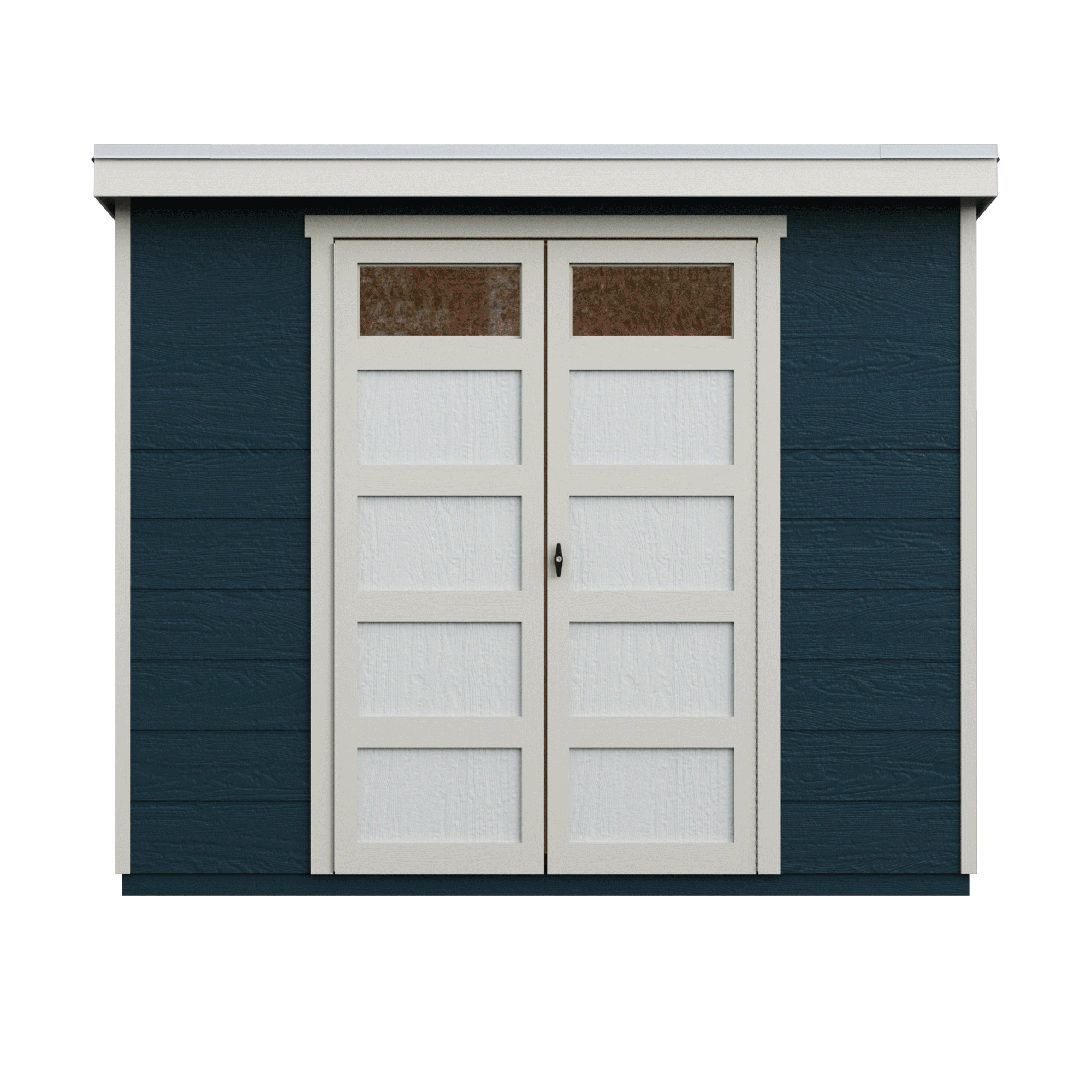 The Sherbrooke Shed offers modern design with durable, weather-ready features. Measuring 8′ x 6′ (48 sq. ft.), it includes a Palram® Suntop® polycarbonate roof for superior weather protection. The 7-foot tall front wall and 6-foot tall back wall easily accommodate long-handled tools, while 48-inch wide double doors provide easy access to equipment. Two transom door windows allow natural light inside, and a locking T-handle with two keys keeps your belongings secure. Build it yourself to save or choose professional installation for a hassle-free setup.