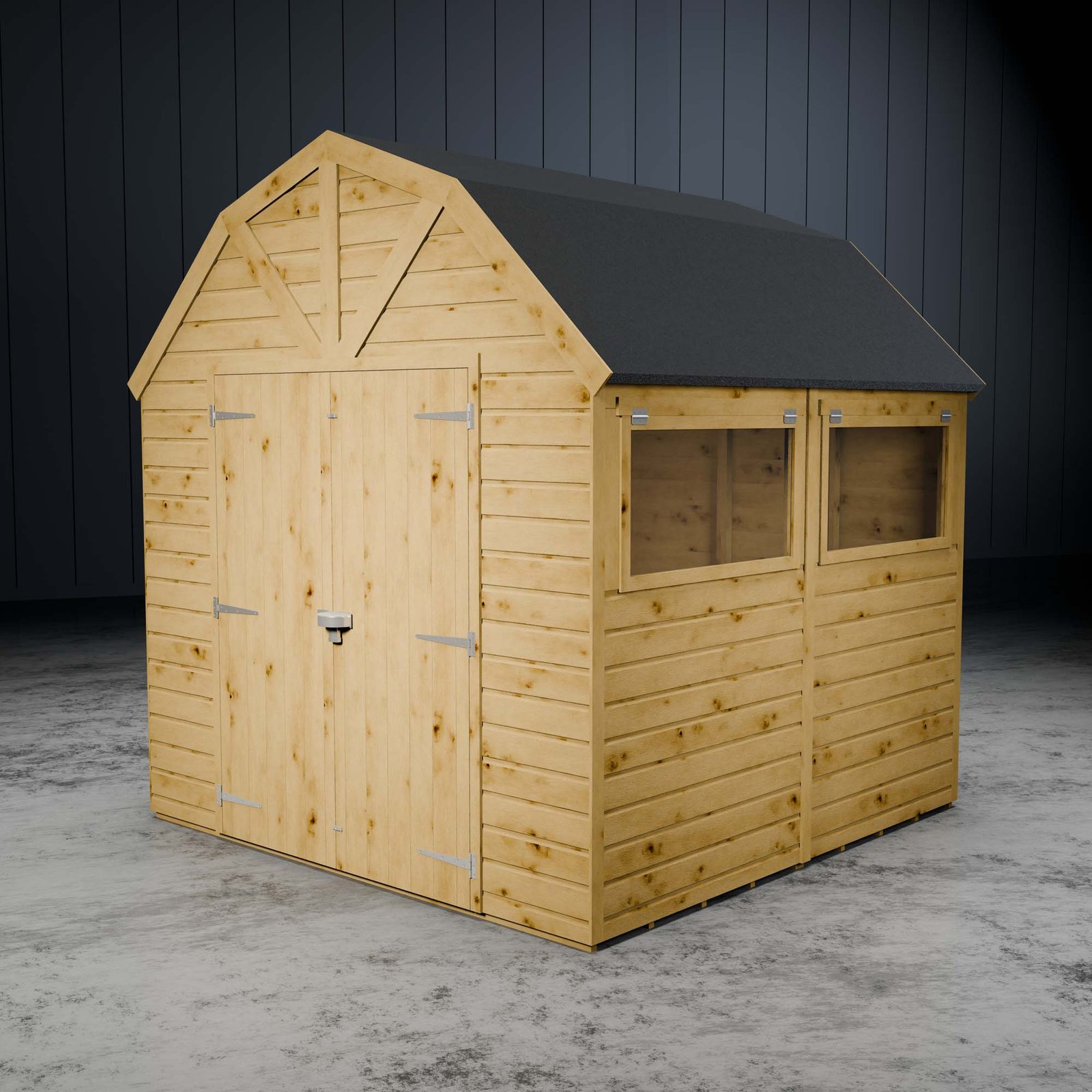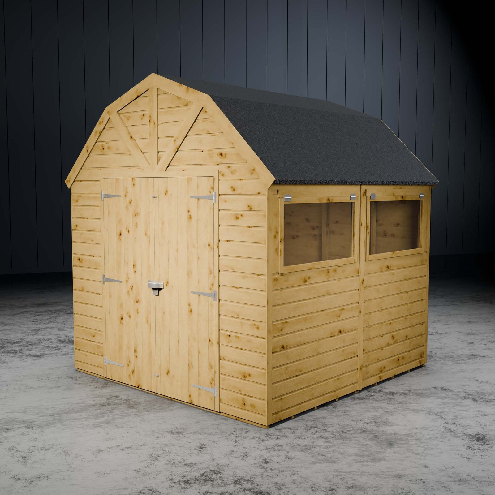 Our Premium Dutch Barn Shed is a unique and spacious storage solution. The smaller of our dutch barns, the spacious interior is ideal for storing any outdoor equipment you’d like away from your home, or even seasonal items such as Christmas decorations. The stylish Dutch barn roof also provides this shed with a generous roof height. Making it the ideal place to store tall items such as strimmers and ladders. Featuring double doors, this shed makes accessing and storing your items super easy. An opening Styrene glazed window floods this shed with light, creating a bright and welcoming interior. Perfect if you are planning to use this space as a functioning workshop or hobby room. We manufacture this building here in the UK, using sustainably sourced and certified timber.