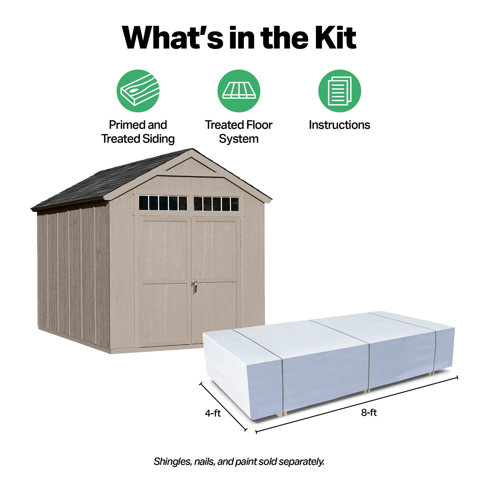 The Siena Shed offers spacious, organized storage with a touch of elegance. Measuring 8′ x 12′ (96 sq. ft.), it features 7-foot tall sidewalls to easily accommodate long-handled tools. The 64-inch wide double doors provide effortless access to large equipment, while two transom door windows fill the interior with natural light. An included shelf and overhead loft add extra storage space, keeping your outdoor essentials neatly organized. Build it yourself to save or choose professional installation for a hassle-free setup.