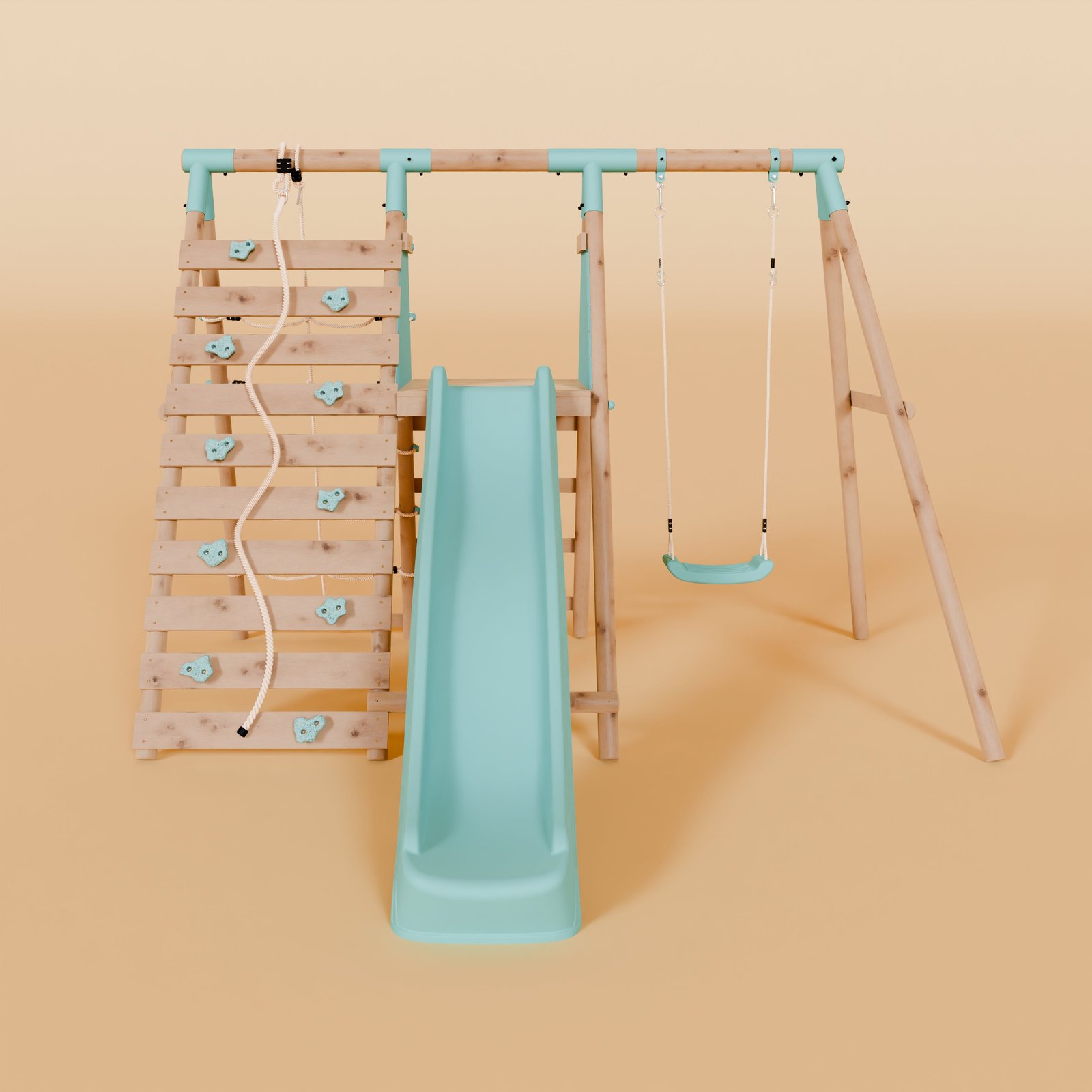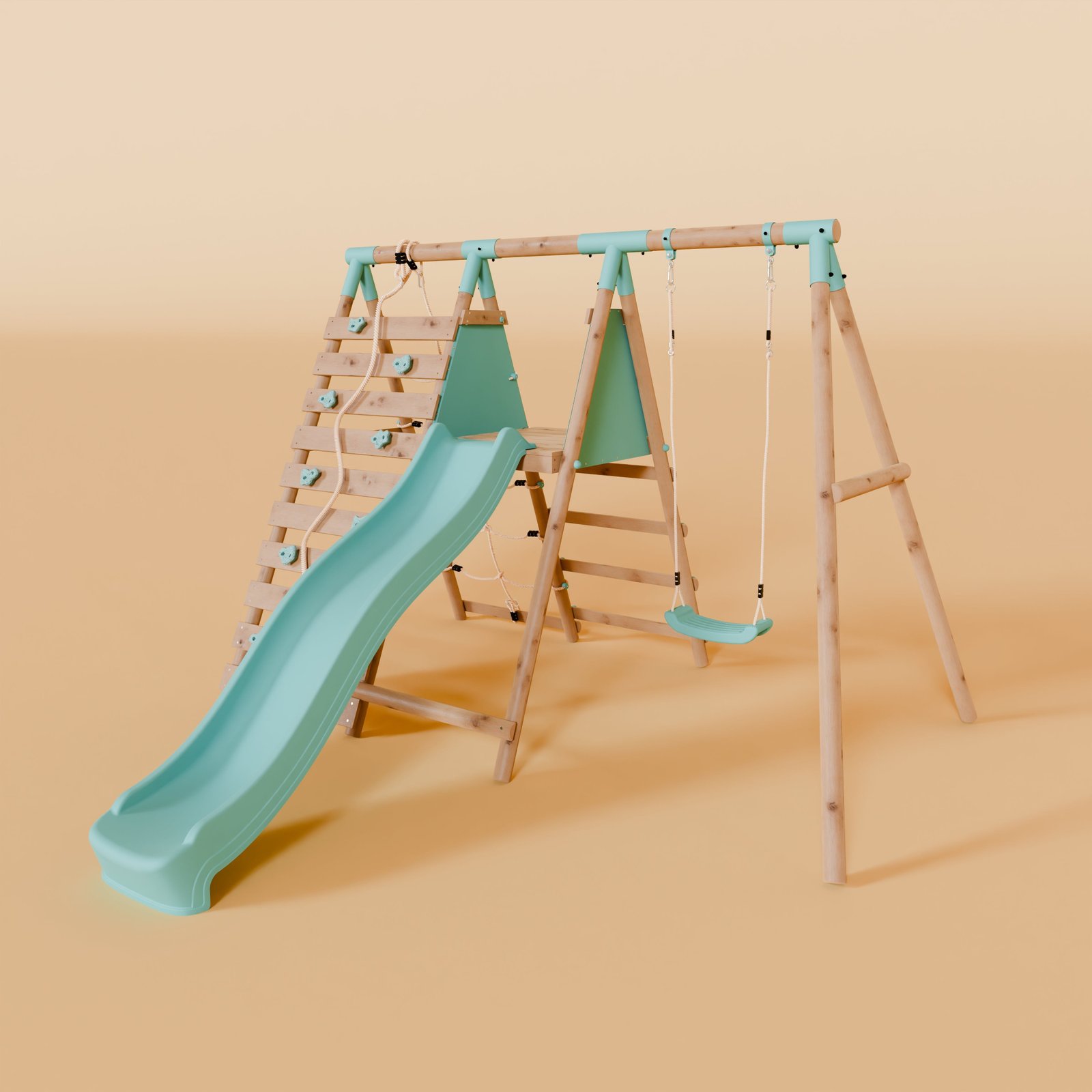 Create a complete outdoor play experience with our Single Wooden Swing Set featuring a Climbing Wall and Slide. Thoughtfully designed for larger gardens, this multi-functional set offers the perfect blend of movement, challenge, and imaginative play—all in one beautifully finished structure.
