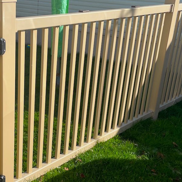 Our Picket spacing is 3.5″ (90mm) For added strength & Security of young children and small animals