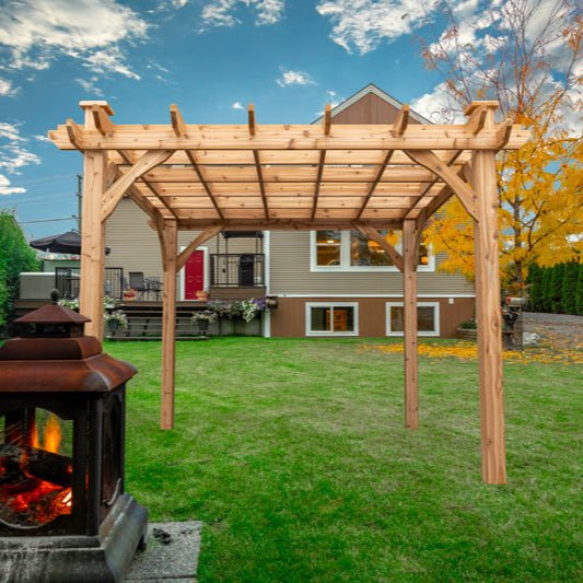 Cedarshed features the fabulous “THE KALAMALKA” outdoor BBQ pergola. Stylish and functional, our high-quality, affordable 10ft x 10ft cedar pergolas make an excellent backyard BBQ retreat for friends and family. If you’re looking for a way to enhance the value of your home, take a look at The Kalamalka. During warmer seasons a pavilion can block heat and in the colder seasons protect your outdoor spaces from the elements.  FREE Shipping, Always!