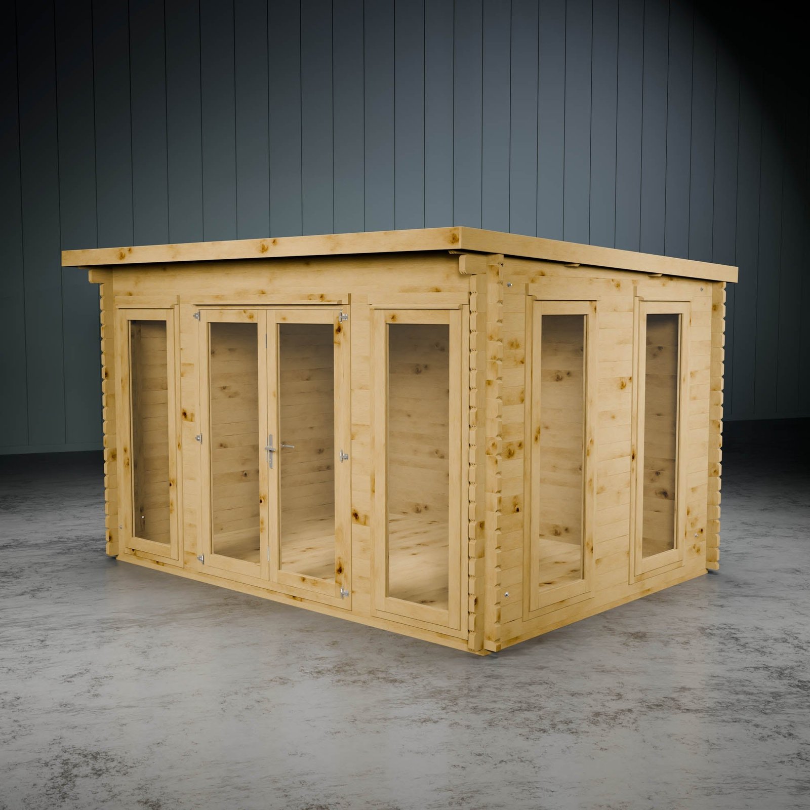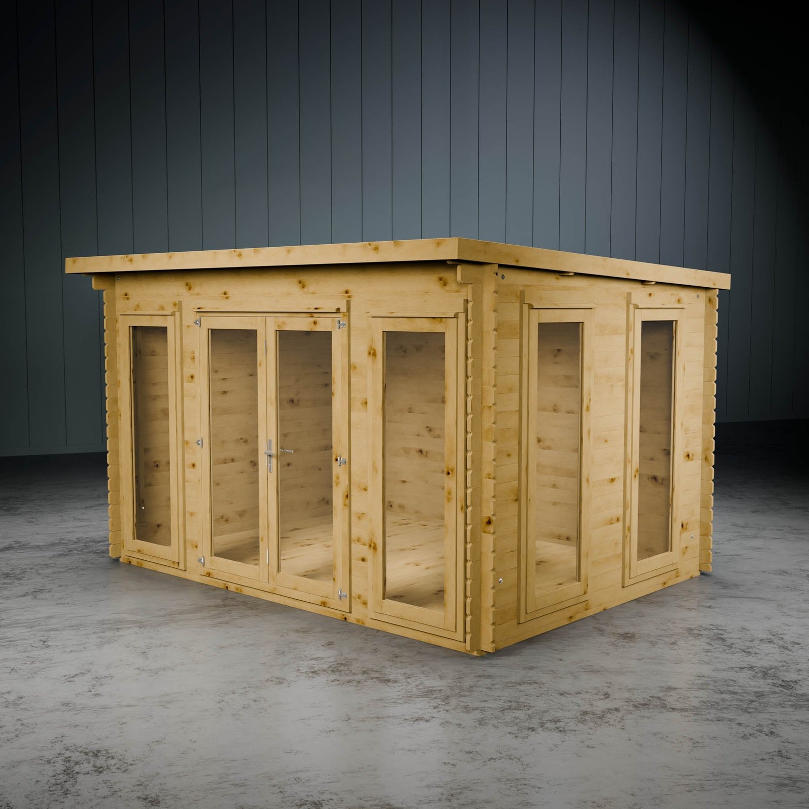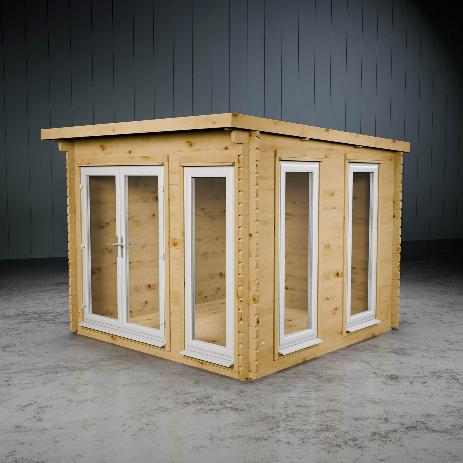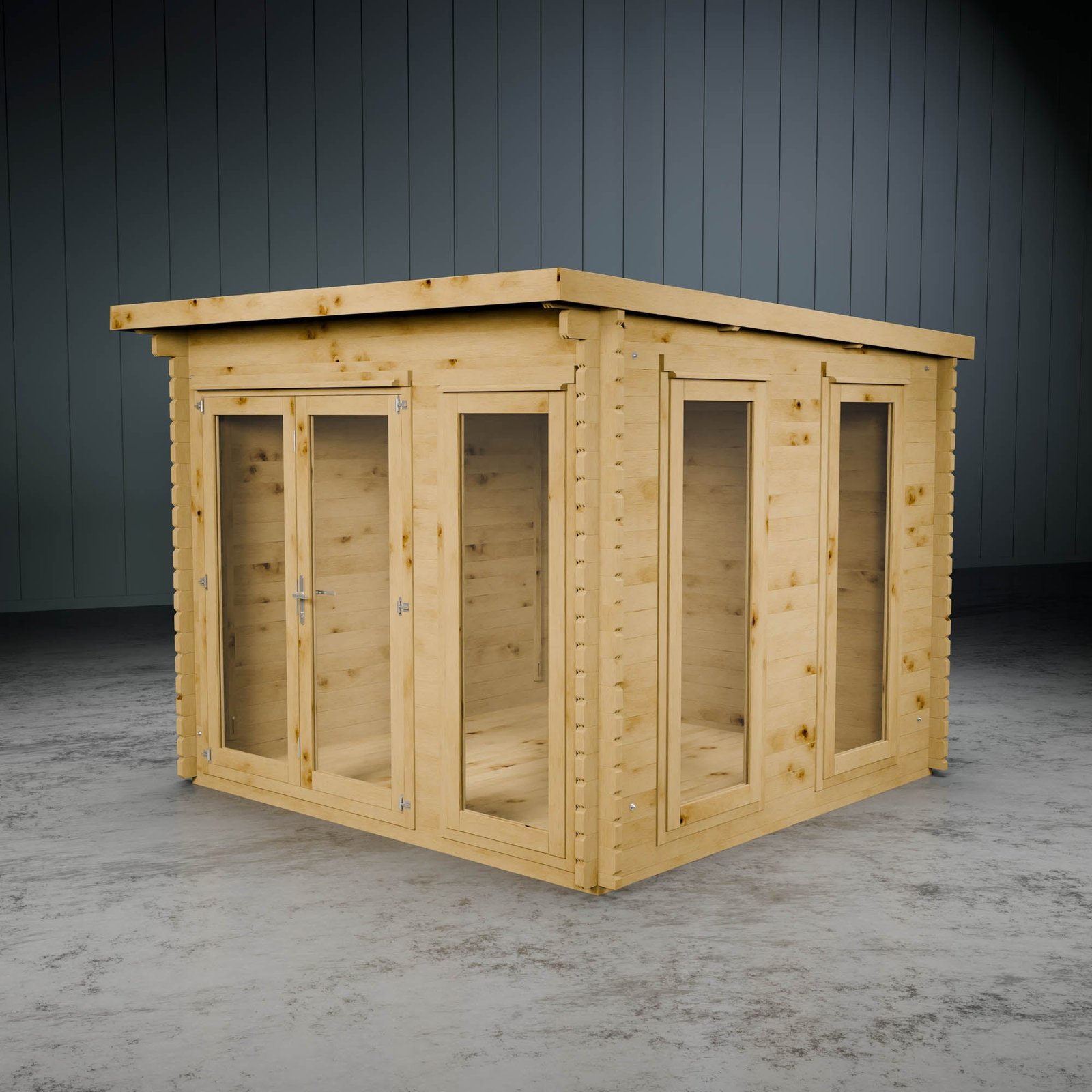 Featuring a pent roof design, the Wren Log Cabin has a modern and streamlined aesthetic. The inclined roof allows the structure to discreetly blend into any garden setting, all while creating a warm and snug interior ambience.