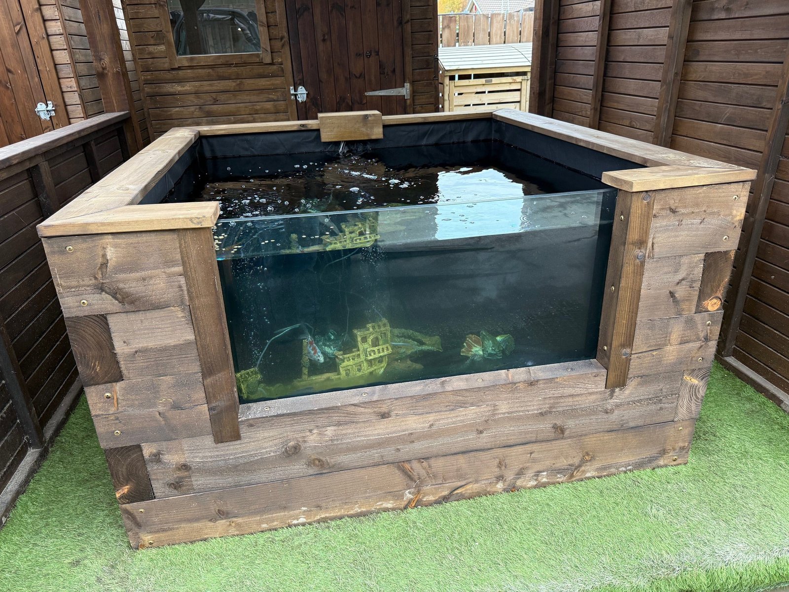129 Gallon Raised, Stand-alone Wooden Fish Pond, 1.5M x 1M, 44mm thick, 697mm high, 589 litres. These beautifully crafted ponds
